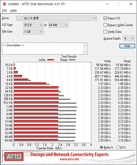 스펙 상 읽기 속도 최대 3,400MB/s, 쓰기 속도 최대 2,300MB/s이며 벤치마크 상 최대 속도 보다 조금 더 높은 속도로 측정되었습니다.