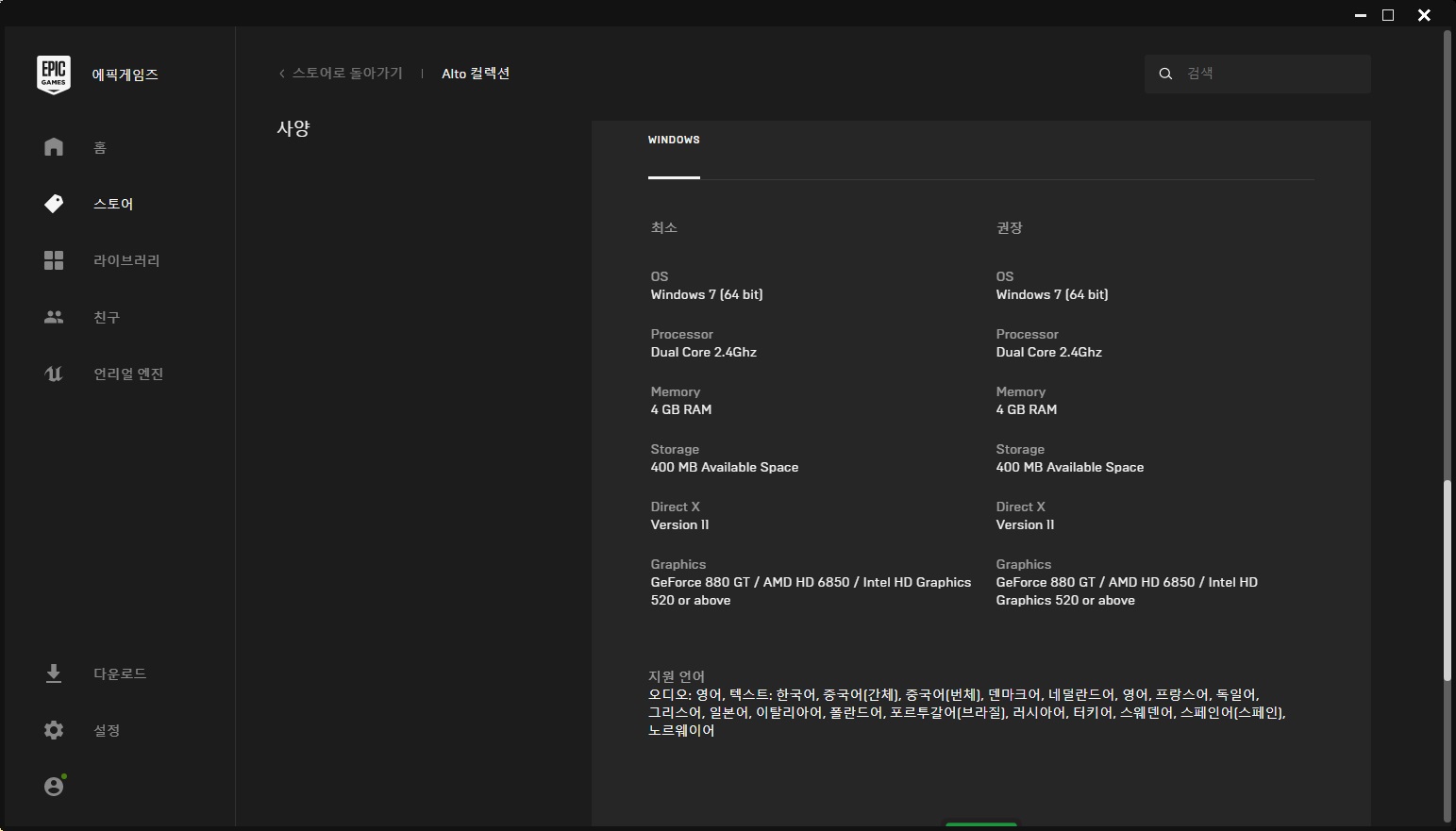 권장 사양은 지금 출시되는 인텔, AMD 내장 그래픽 정도의 사양에서도 구동이 가능할 정도입니다.