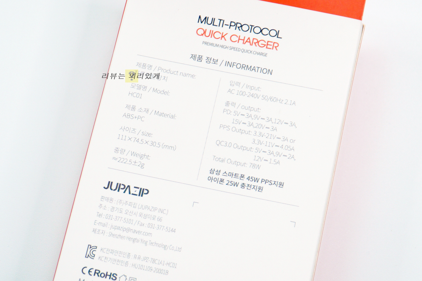 최대 78W라는 말은 2포트 18W + 60W 합계 78W라는 의미입니다. 그리고 삼성 스마트폰에서 적용되고 있는 PPS 45W 고속 충전과 아이폰 25W 고속 충전을 지원합니다.