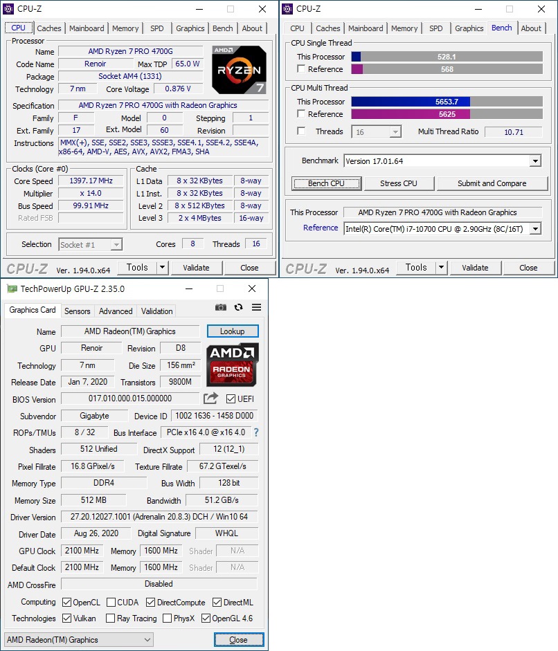 CPU-Z, GPU-Z로 확인한 AMD 라이젠 7 PRO 4750G 르누아르