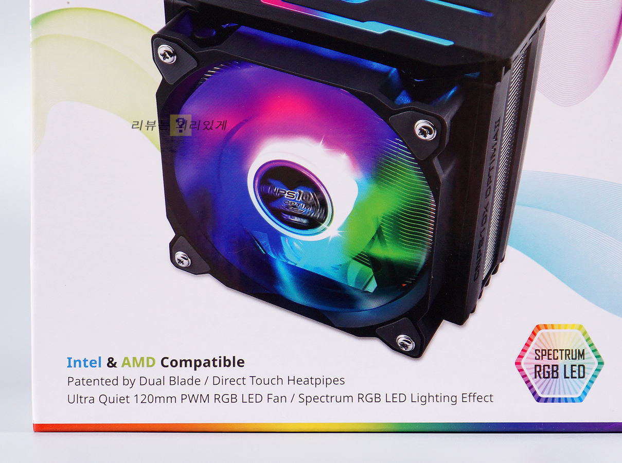 듀얼 블레이드 팬과 더불어 CNPS10X 만의 다른 특징은 스펙트럼 LED입니다. 팬과 방열판 상단부에서 점등되는 LED는 RGB 방식으로 여러 가지 색상들이 은은하게 보여주며 CNPS10X만의 분위기를 보여 주고 있습니다. 단 LED까지 사용하고 싶다면 구성품에서 Y자 케이블을 연결해서 사용해야 합니다.