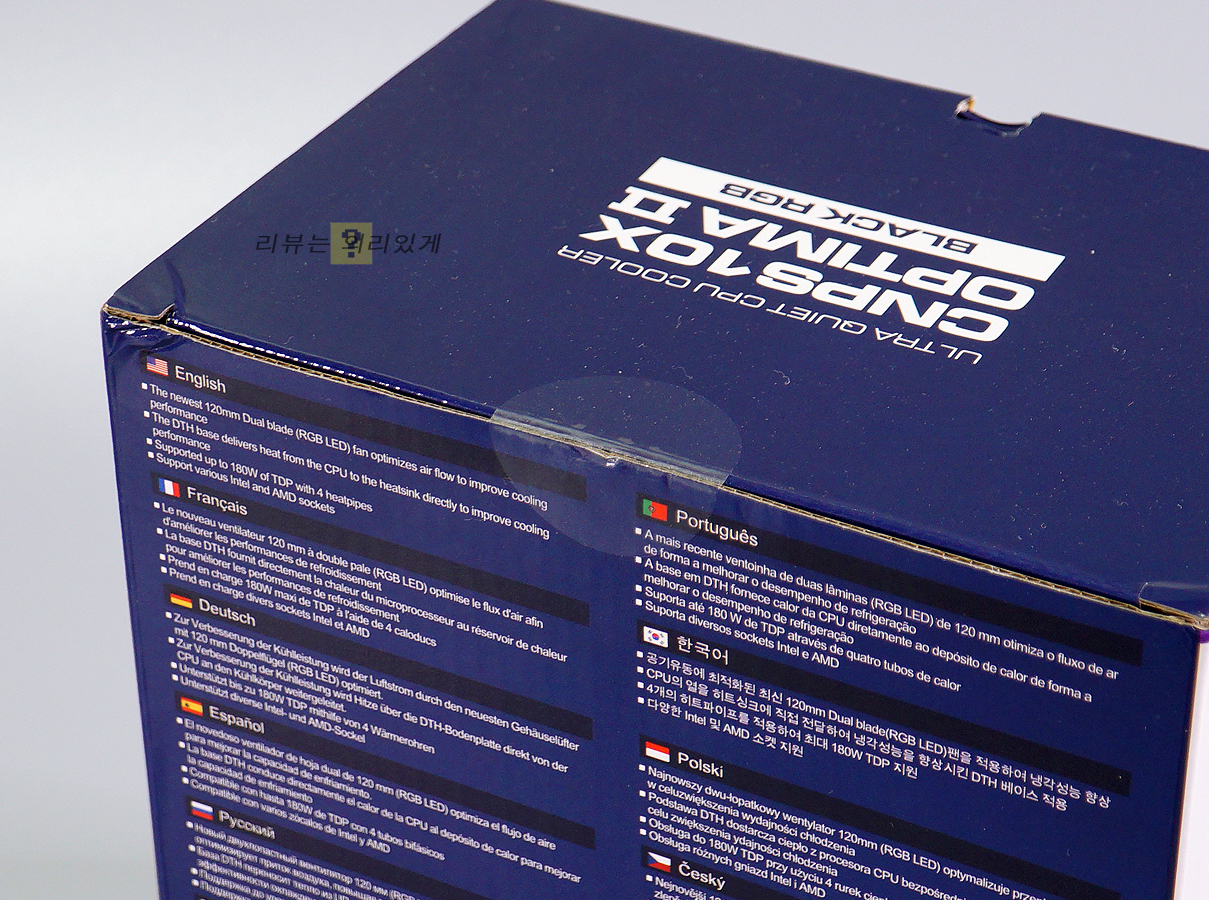 측면에는 CNPS10X OPTIMA II라는 문구를 확인할 수 있으며 팬에는 쿨링 방향에 대한 설명을 확인할 수 있습니다.