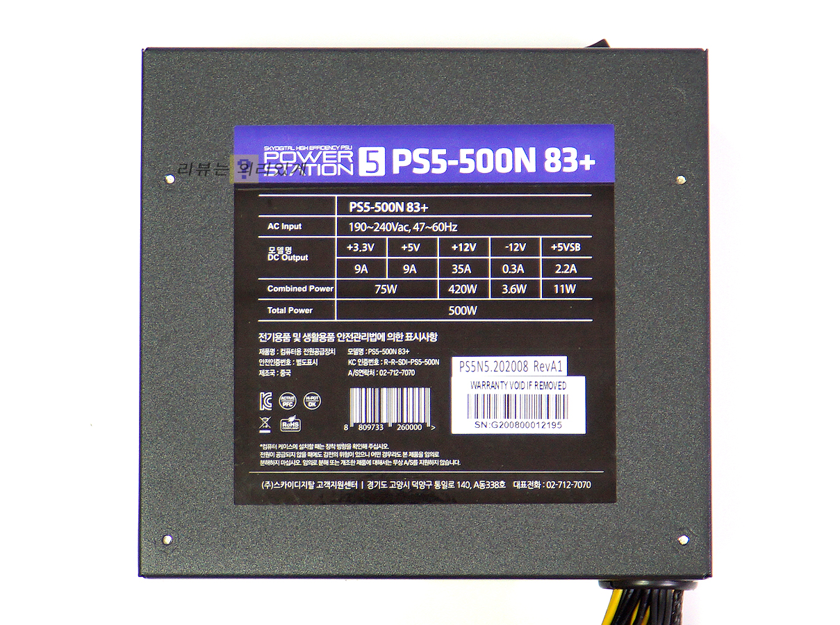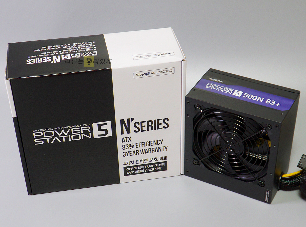 스카이디지탈 파워스테이션5 PS5-500N 500W 파워는 80PLUS 인증을 받지 않았으며 액티브 PFC가 포함되어 있지 않는 등 고사양 PC보다는 저가 보급형 PC 사용을 겨냥한 듯한 파워로서 효율 인증을 받지 않아 그만큼 가격이 저렴해졌다는 특징이 있습니다.