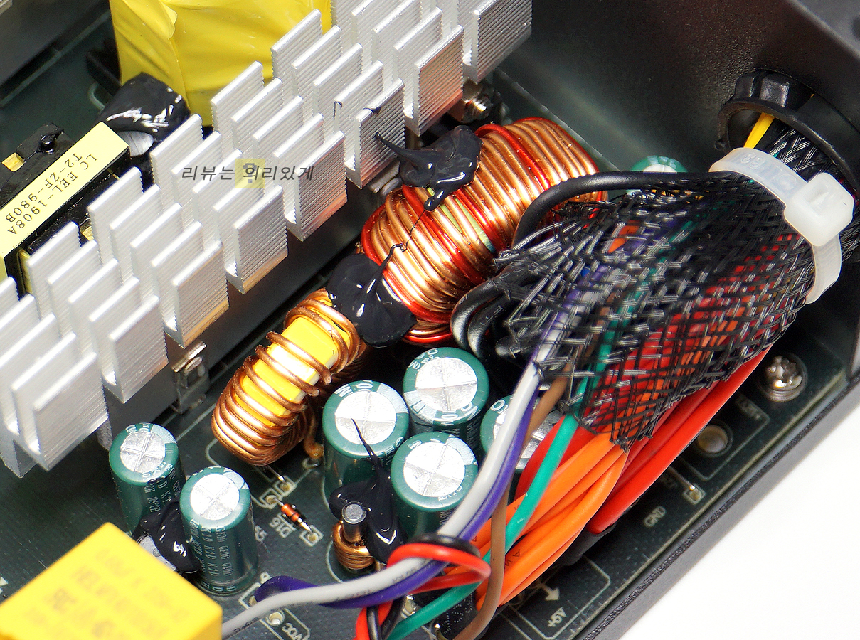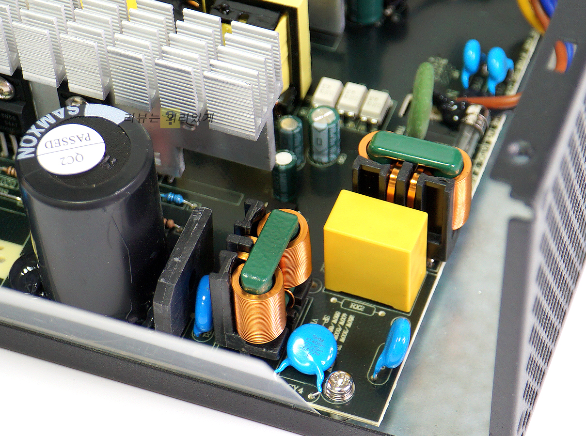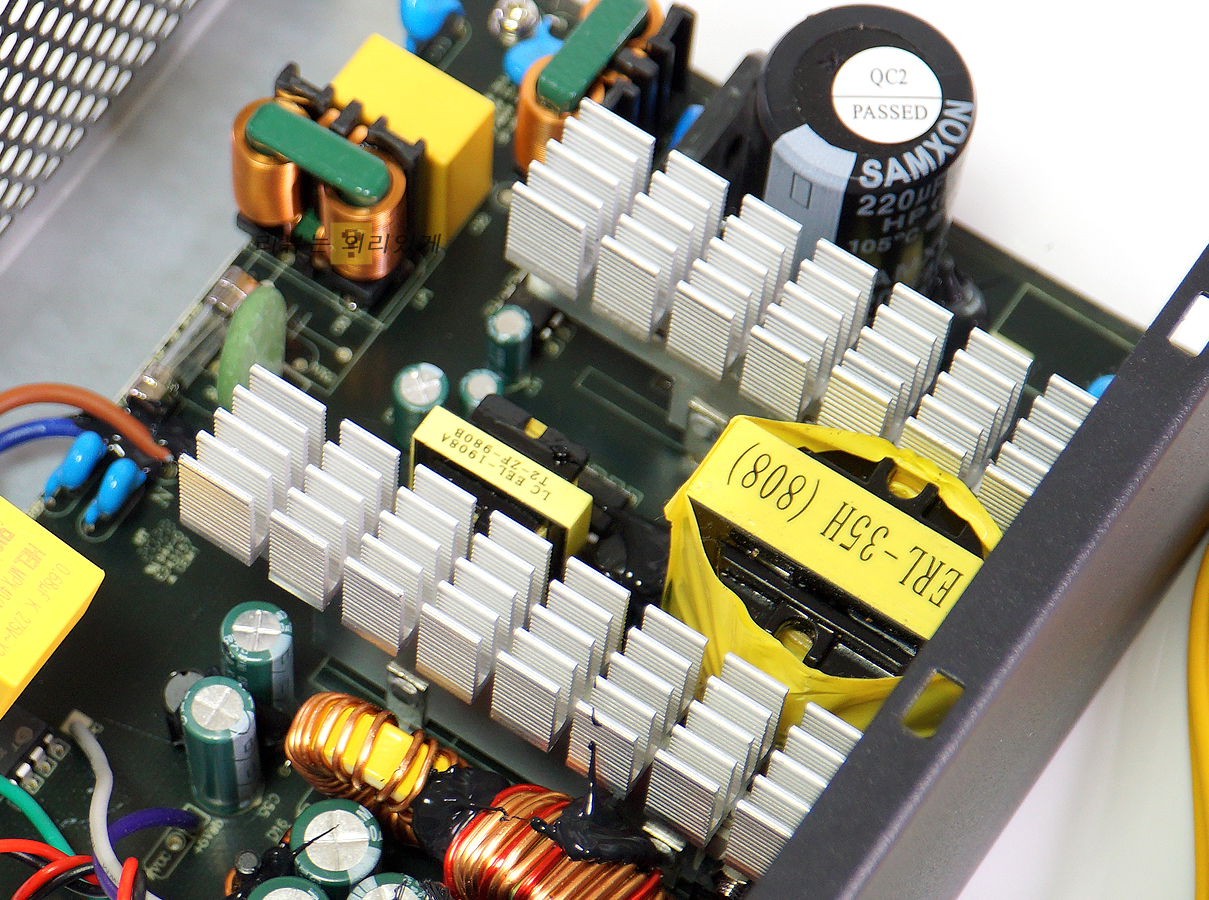 스위칭 트랜스 사이에 발열 해소를 위한 방열판이 부착되어 있습니다.