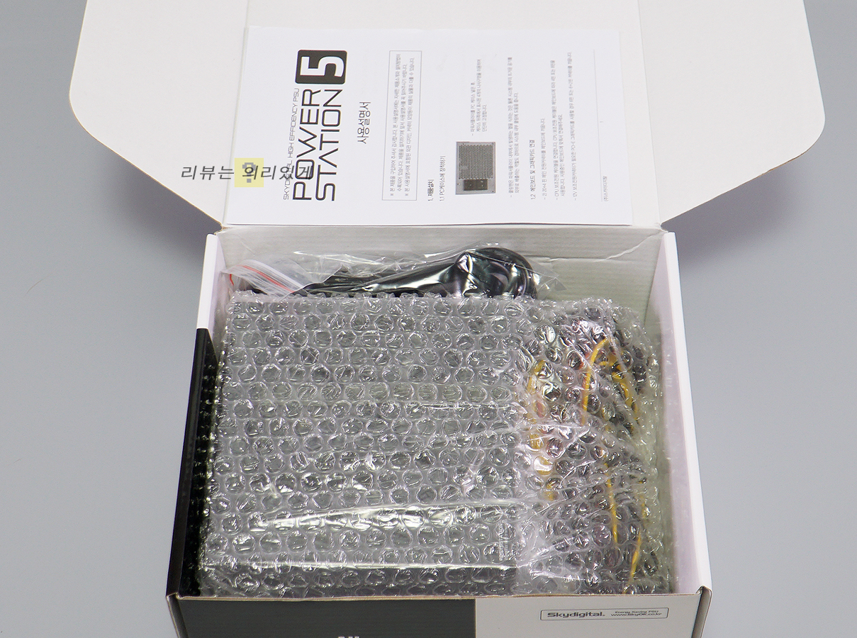 파워는 에어캡으로 보호하고 있으며 추가로 비닐 포장되어 있습니다. 케이블 타이, 전원 케이블, 조립 나사, 설명서가 구성품으로 제공됩니다.
