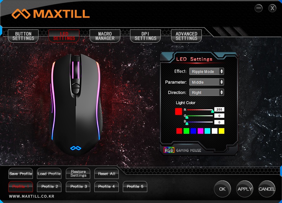 G20 PRO는 다른 맥스틸 마우스와 동일한 소프트웨어를 지원하며 좌측 마우스 이미지를 제외하면 동일한 UI를 확인할 수 있습니다. 5개의 큰 메뉴로 나누어져 있으며 우측에 세부적인 옵션 설정이 가능합니다. 다만 한국어를 지원하지 않는 것은 다소 아쉬운 편이라 생각합니다.