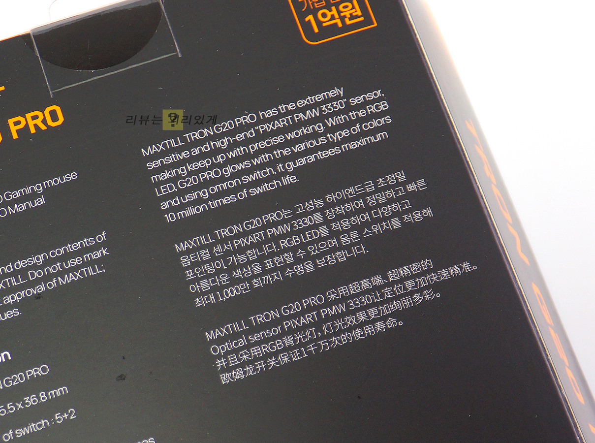 OMRON 스위치가 사용되었으며 최대 1,000만 회 수명을 지원합니다. 또한 보급형 마우스에서 쉽게 볼 수 있는 PMW 3330 센서가 사용되어 2만 원대로 출시된 무난한 마우스 중 하나로 볼 수 있습니다.