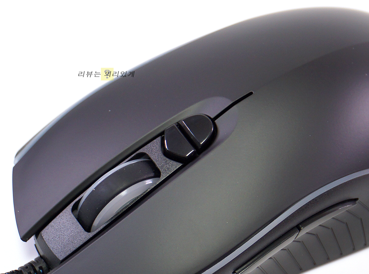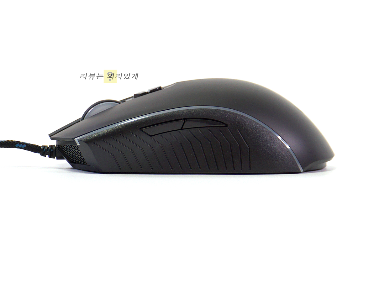 다만 손크기에 따라 다르겠지만 마우스를 조금 뒤로 그립 할 경우 앞쪽 측면 버튼을 제대로 누르기 어렵다는 점이 문제였습니다. 핑거 그립 이미지에 나와 있듯이 앞쪽 측면 버튼에 엄지가 제대로 닿지 못하는 모습입니다.