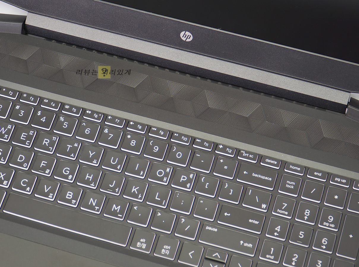 중앙에 HP 로고와 하단의 각인된 파빌리온 로고를 확인할 수 있습니다.