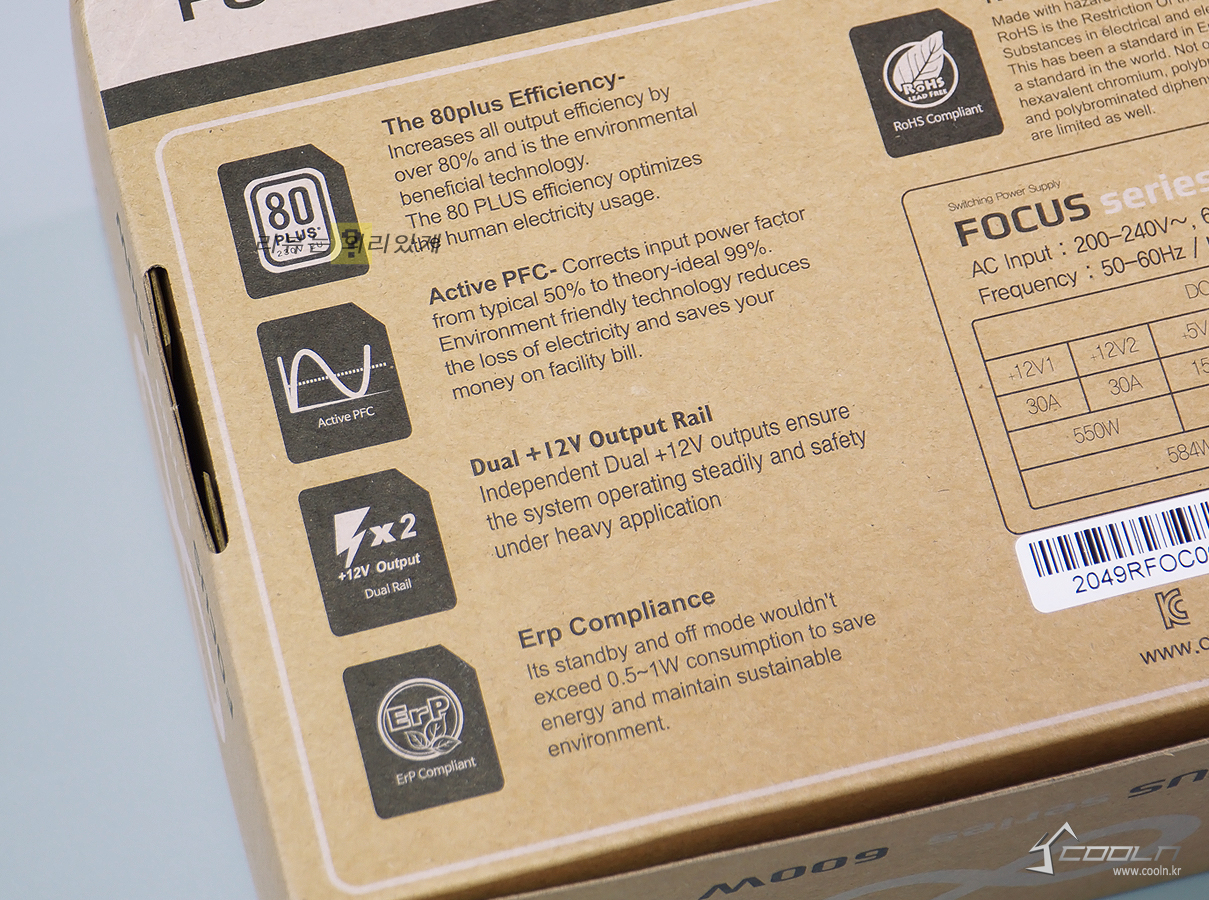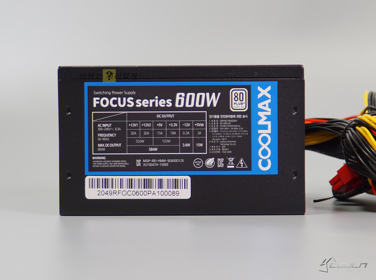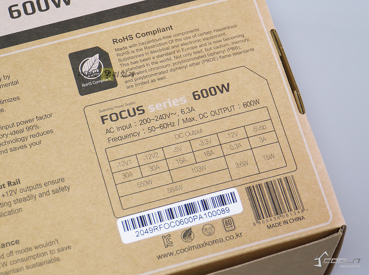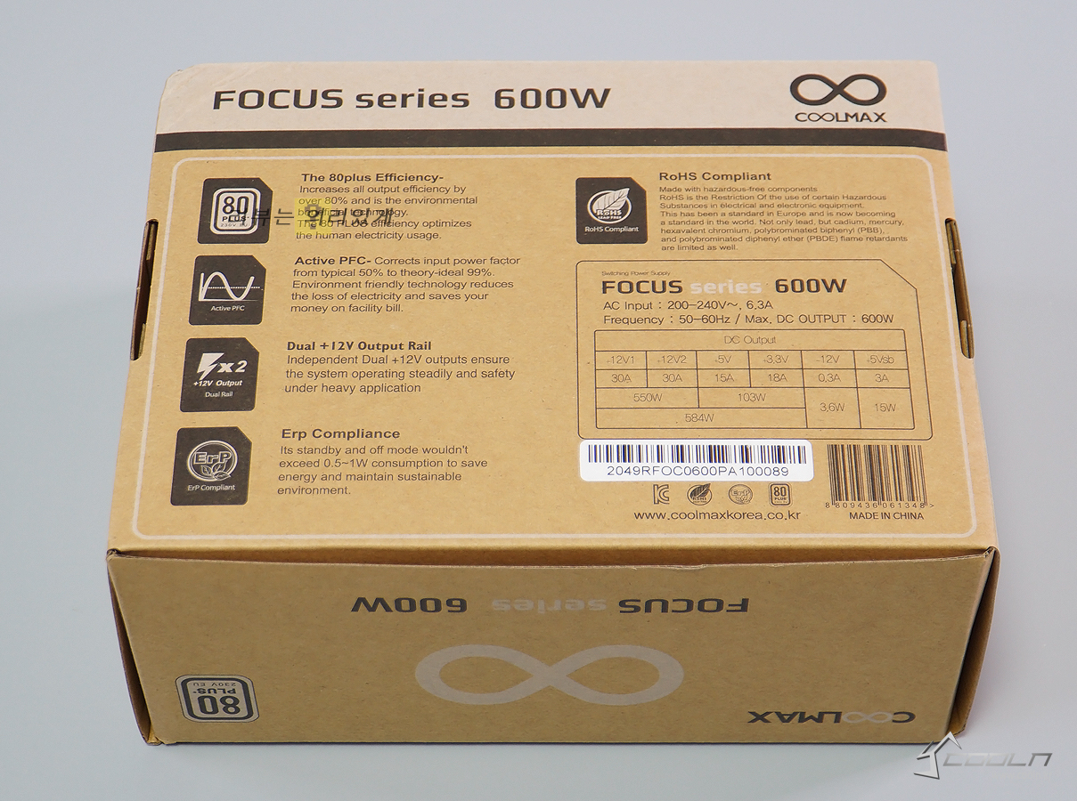 COOLMAX FOCUS의 시리즈는 500 / 600W 두 가지 제품으로 출시되었으며 이러한 용량은 보급형, 사무용, 인터넷같이 단순하거나 아니면 저사양 게이밍 PC를 구성하기에 적합한 정도라 할 수 있습니다. 다나와 기준 최저가 약 40,460원(작성일 기준)으로 새롭게 추가된 80PLUS 230V EU 인증과 액티브 PFC 탑재와 최대 85%의 효율을 보장하는 등 무난하게 사용이 가능한 파워라 할 수 있습니다. 또한 기존 3년의 보증 기간을 5년으로 확대하는 등 경쟁력을 갖추고 있습니다.
