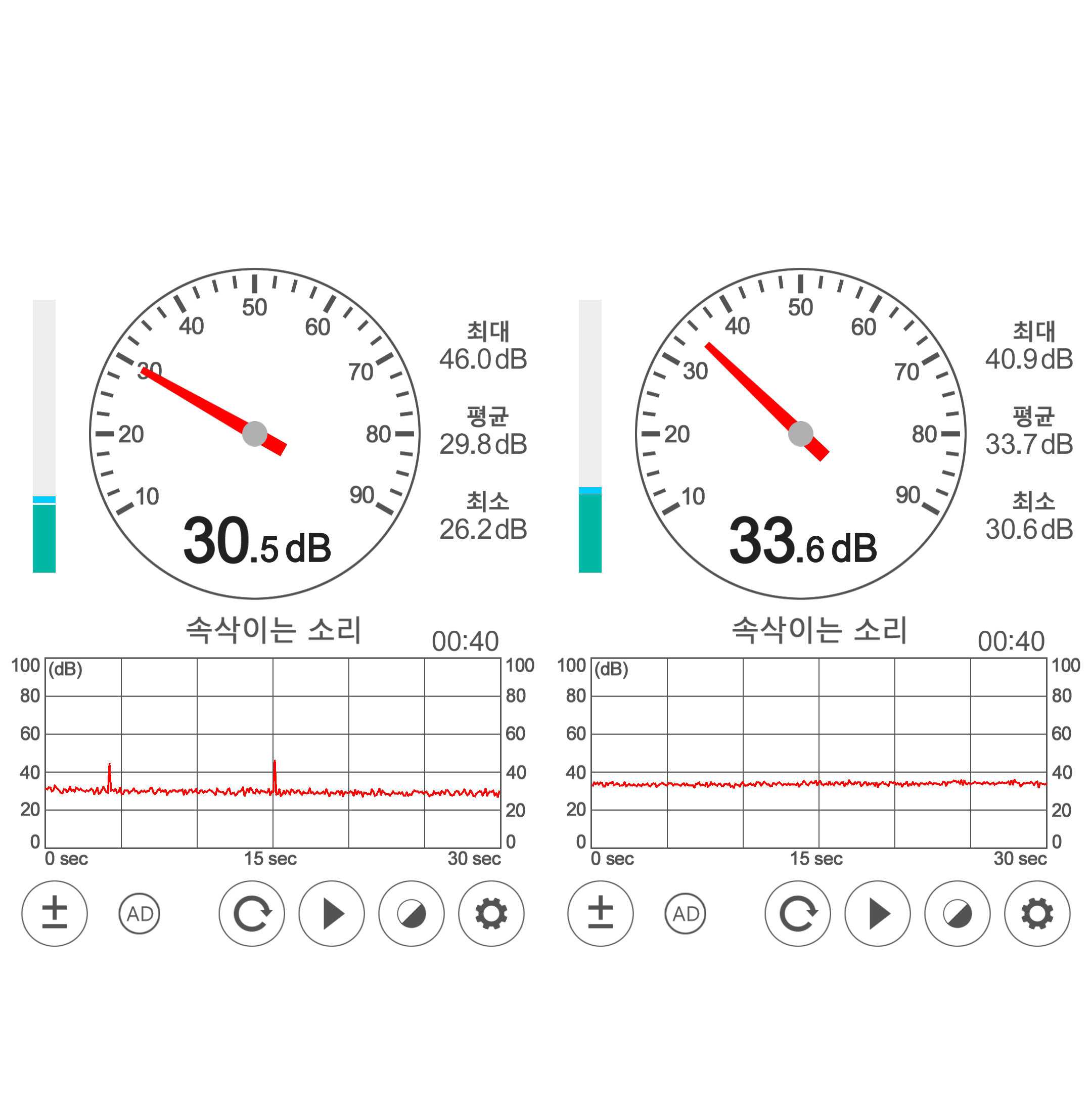 AIDA 64에서 +3.3V와 +5V에서 전압 변동폭은 크게 찾을 수 없었으나 +12V에서는 전압 변동폭이 약간 있음을 확인할 수 있었습니다. 또한 스마트폰 앱으로 아이들과 풀로드 시 소음 측정을 진행하였는데 아이들 시 평균 29.8 dB로 속삭이는 소리 정도로 정숙한 상태로 확인되었으며 풀로드 시 평균 33.7dB로 마찬가지로 속삭이는 소리 정도로 확인되었습니다.
