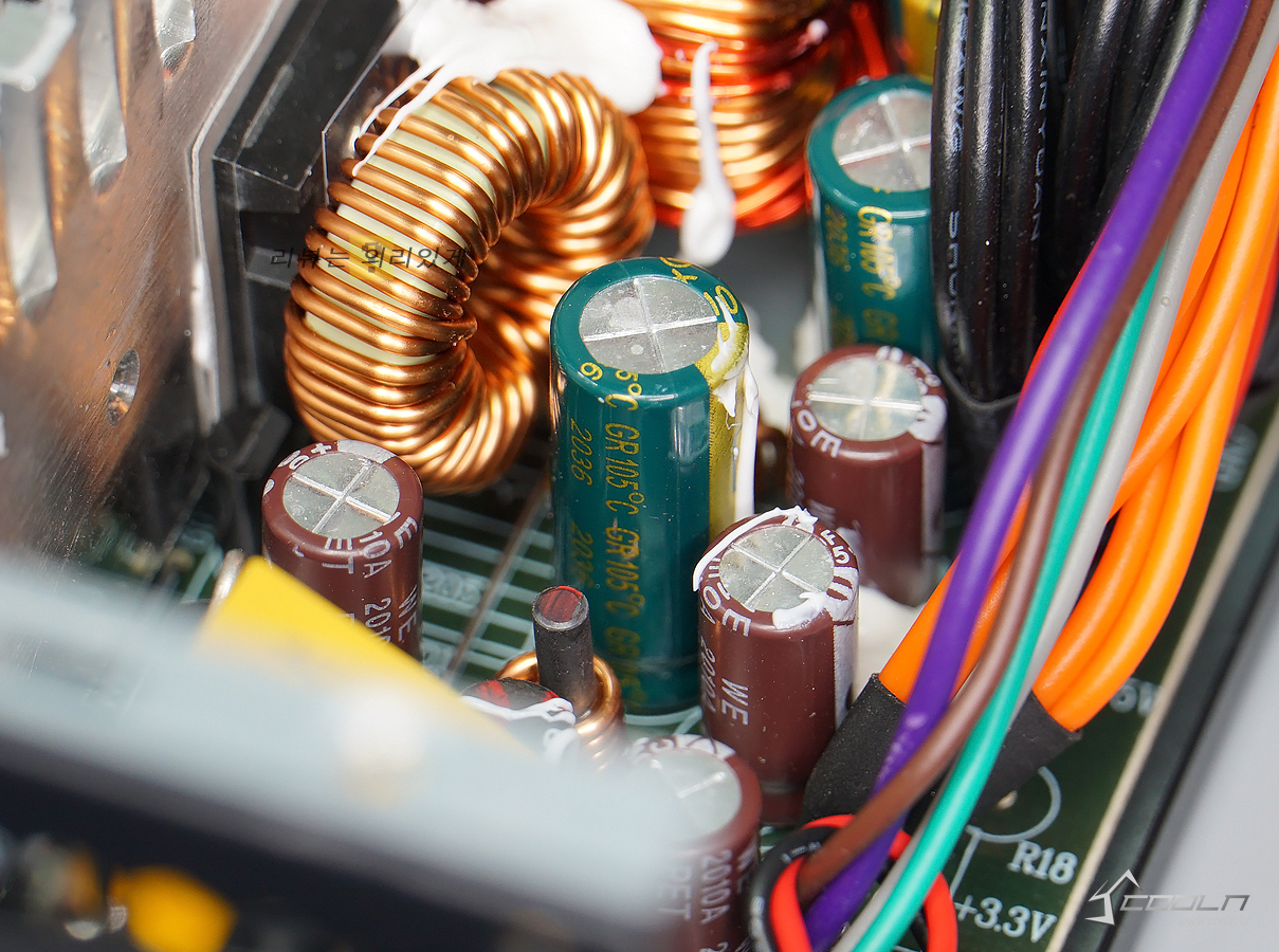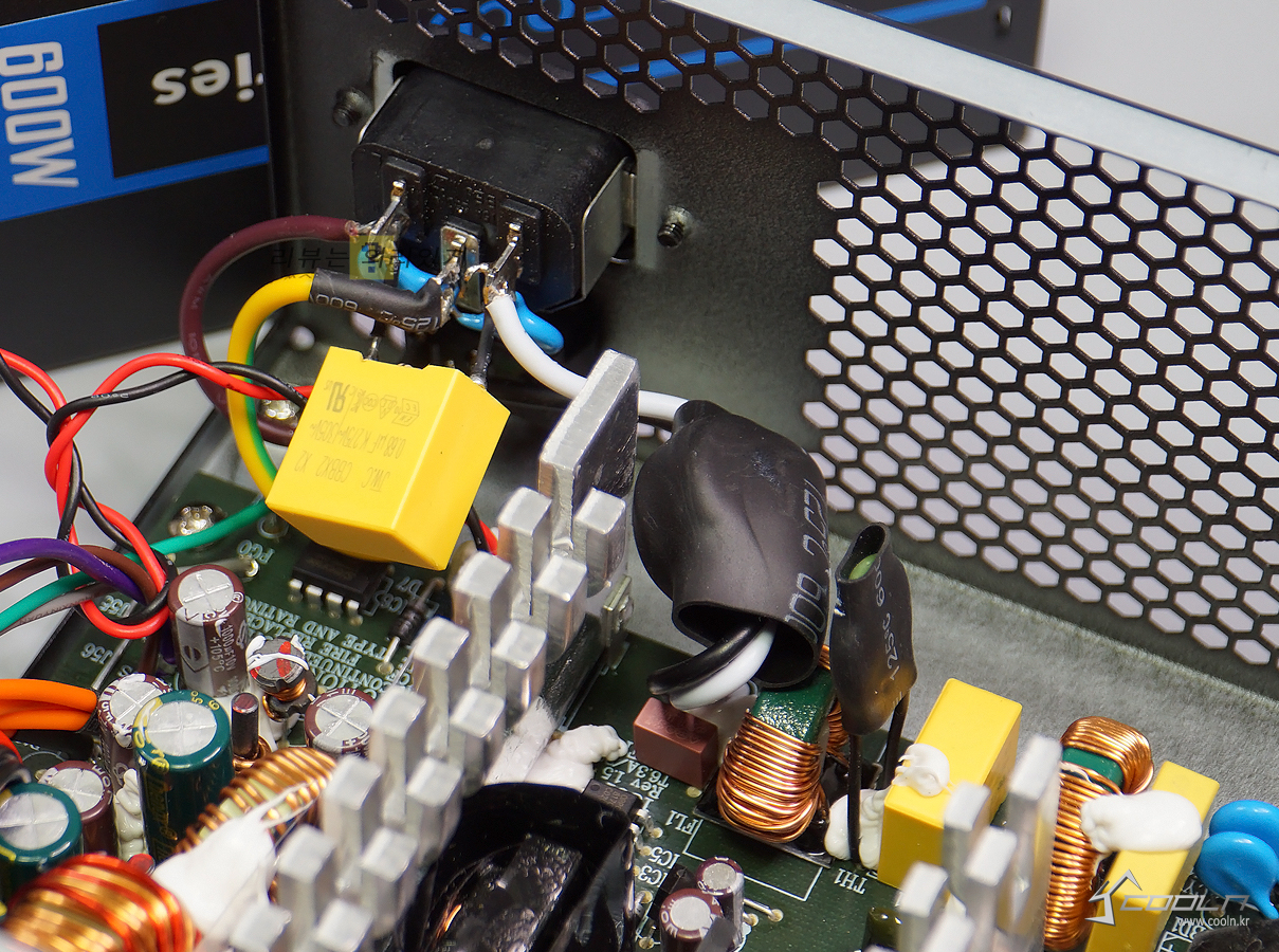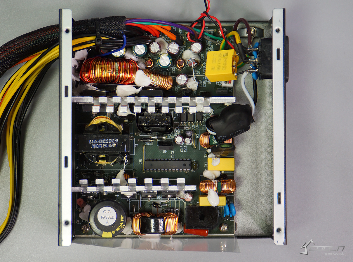 +12V 다중 레일 방식을 사용하고 있으며 액티브 PFC 회로가 탑재 되었습니다. 메인 콘덴서는 Kuang Jin Enterprise사 400v 270㎌ 105℃ 1개가 사용되었으며 AC 전원부에는 EMI 필터와 2차 EMI 필터가 PCB에 부착되어 있습니다.