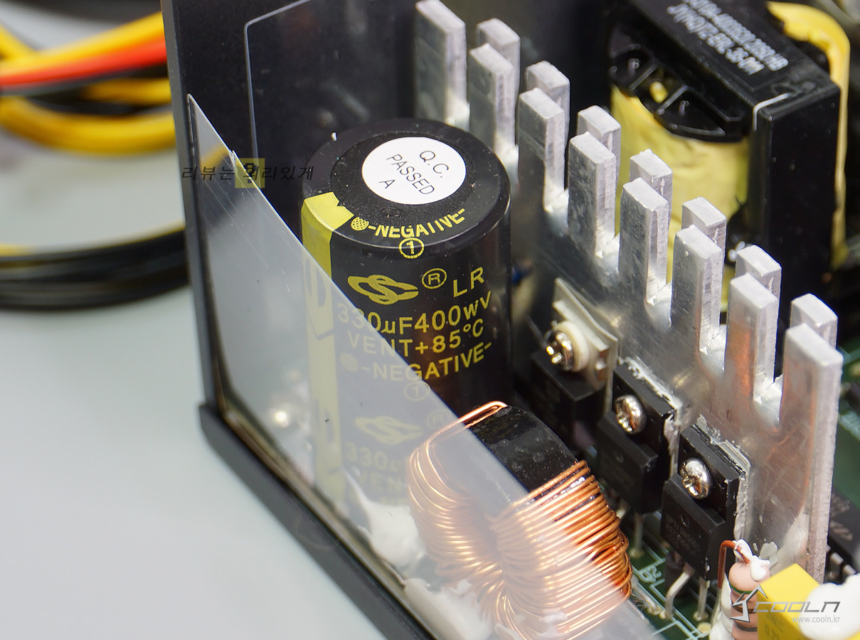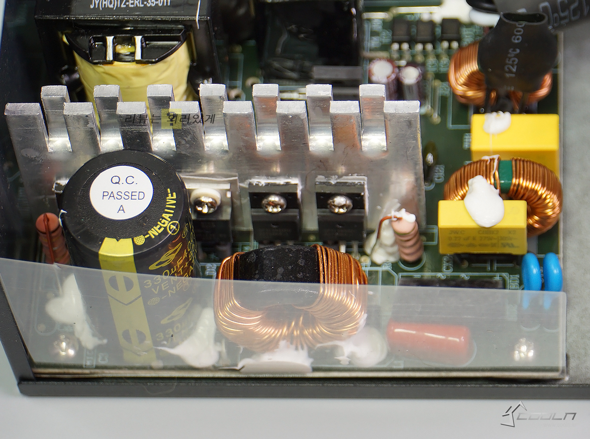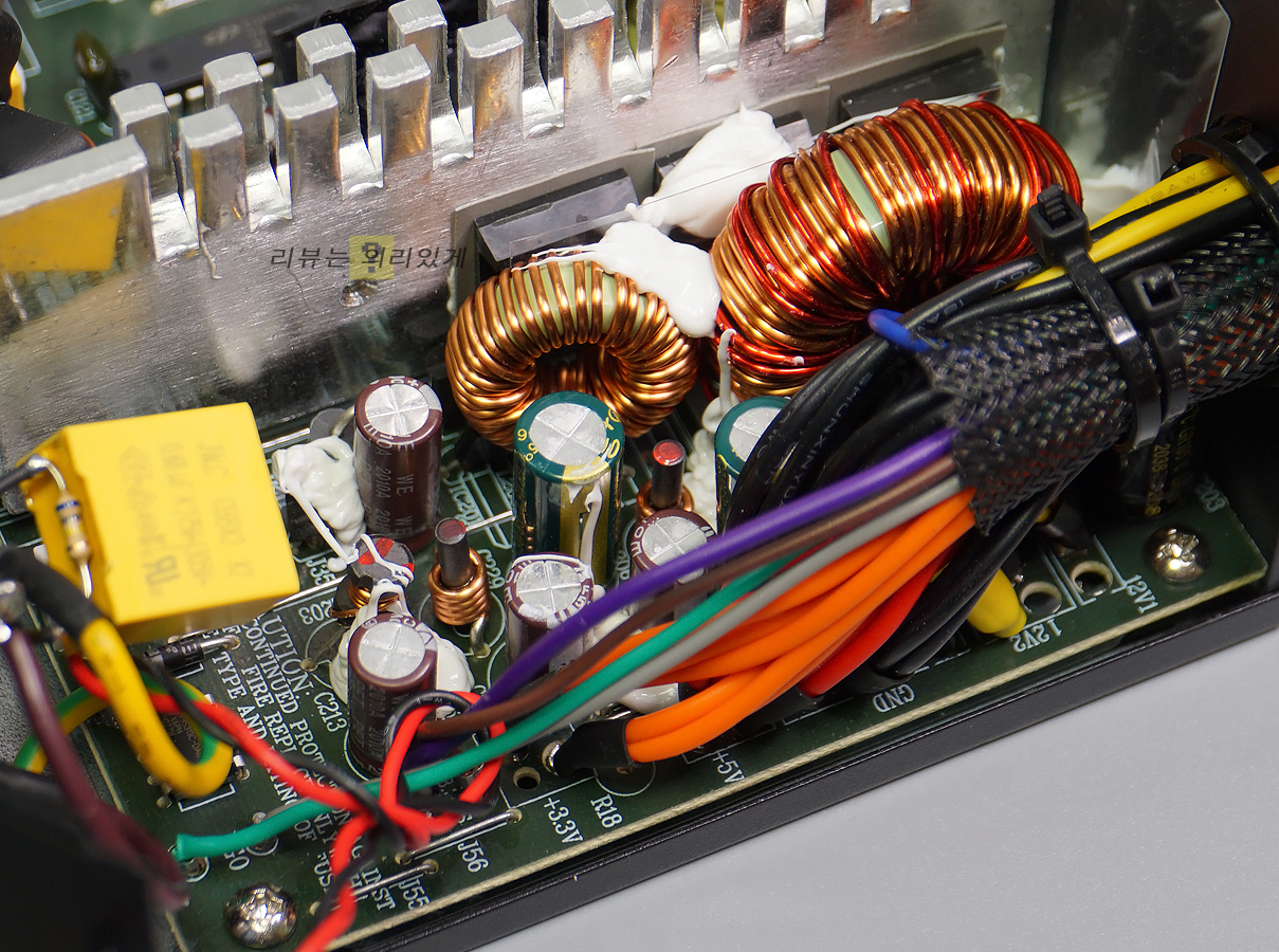 +12V 다중 레일 방식을 사용하고 있으며 액티브 PFC 회로가 탑재 되었습니다. 메인 콘덴서는 Kuang Jin Enterprise사 400v 270㎌ 105℃ 1개가 사용되었으며 AC 전원부에는 EMI 필터와 2차 EMI 필터가 PCB에 부착되어 있습니다.
