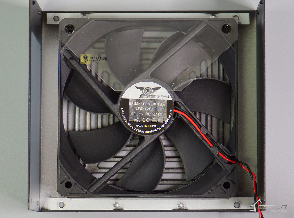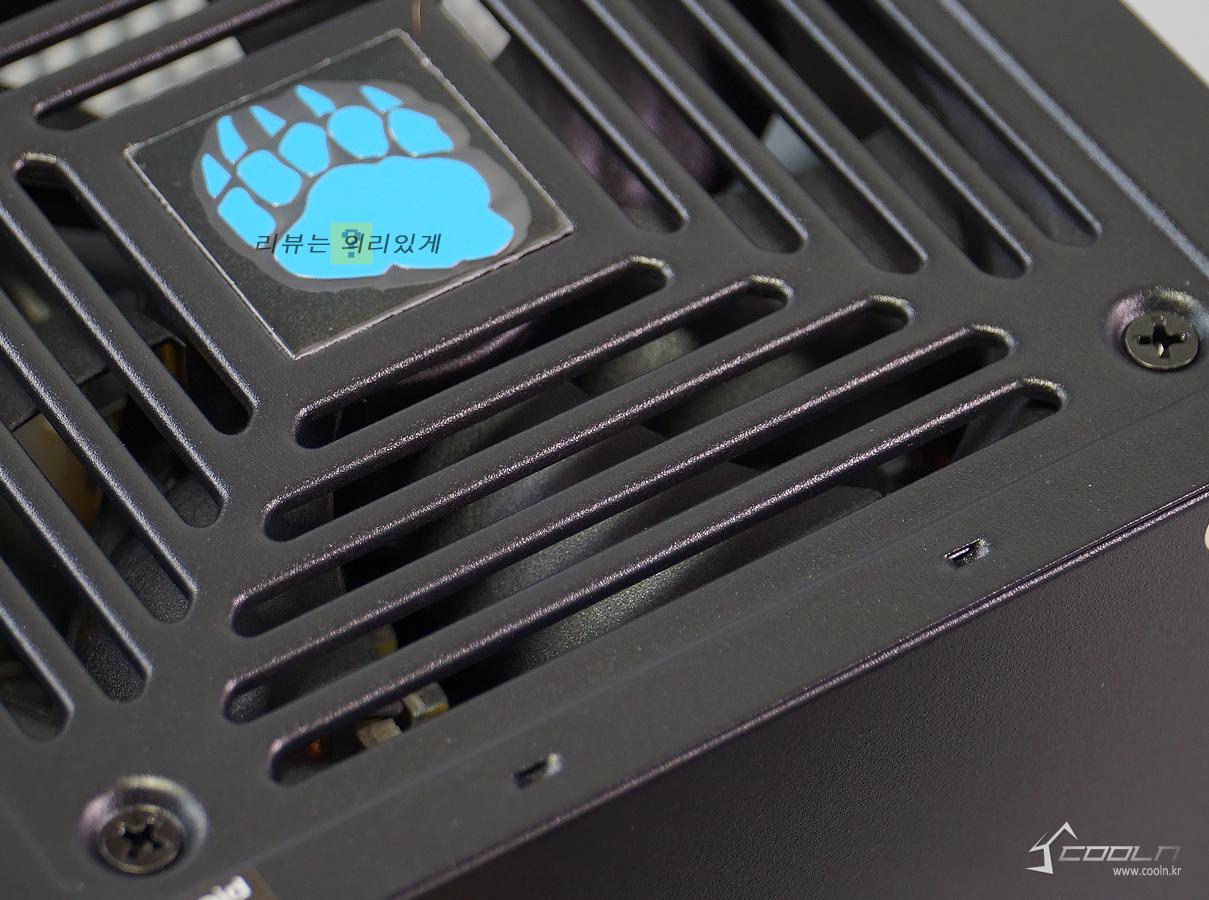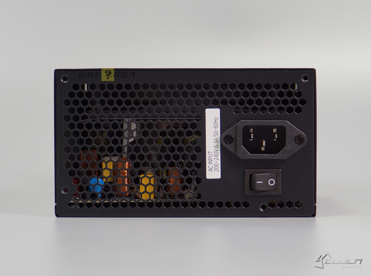 양쪽 측면 모두 스티커가 부착되어 있으며 한 쪽 측면에는 제품 스펙과 시리얼 넘버를 확인할 수 있습니다. 후면 통풍구는 파워에서 많이 사용하는 벌집형 방식을 채택하였으며 220V 전용이라는 것을 확인할 수 있습니다.