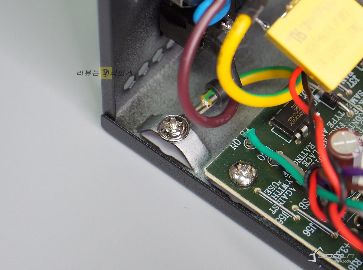 그 외 스위칭 트랜스와 PFC, PWM, SB 제어를 하는 Champion Micro 사의 CU6808X 칩이 사용되었으며 접지는 하단부에 위치해 있습니다.