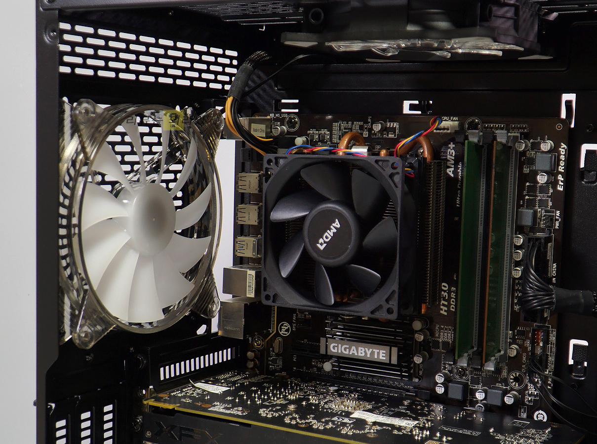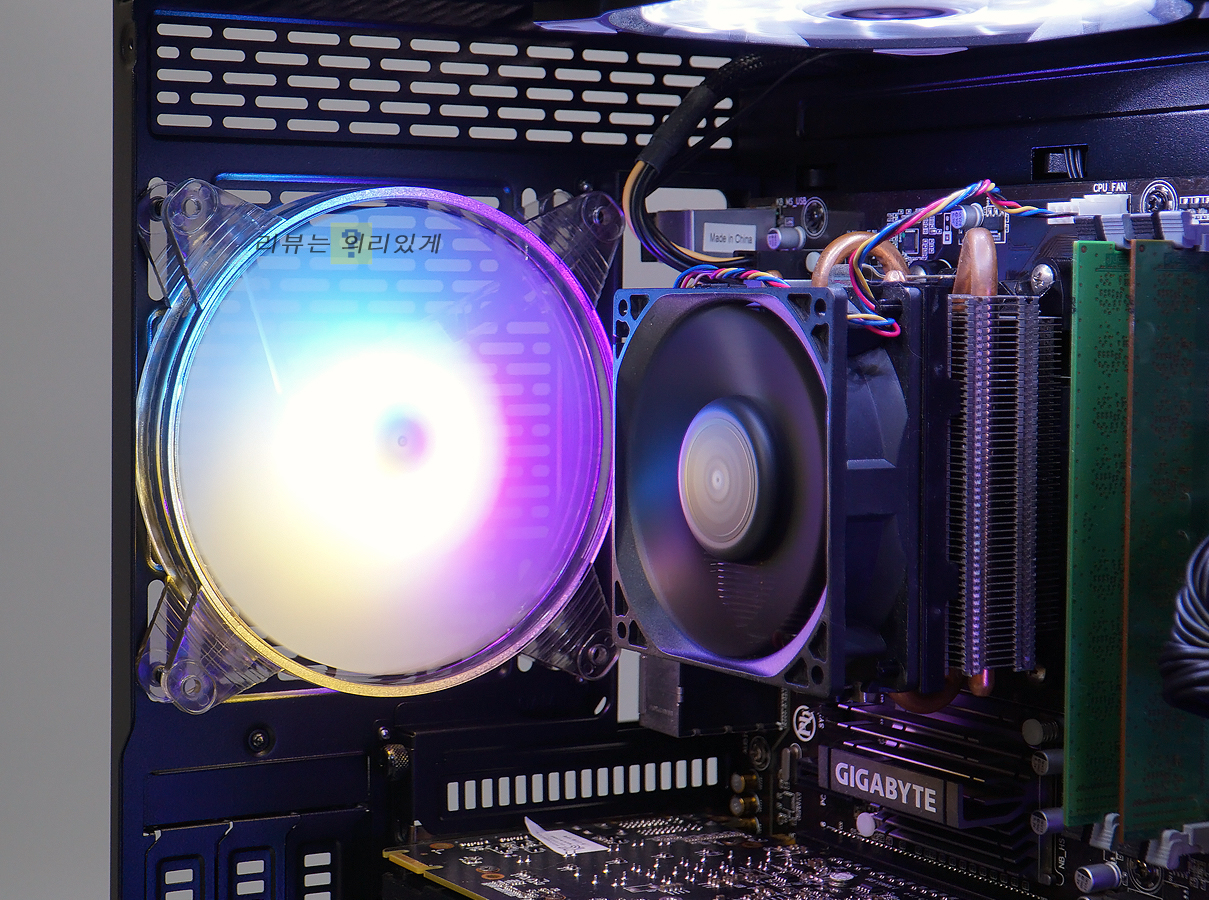 측면 강화 유리는 스모그 처리가 되어 있지 않았으나 LED 팬 효과는 너무 밝지 않은 은은한 정도로 점등되었습니다. 전면, 후면 모두 140mm 팬이 제공되어 무난한 쿨링 효과를 기대할 수 있으며 추가로 상단에 쿨링팬 장착이 가능하니 쿨링만 본다면 무난한 편이라 할 수 있습니다.