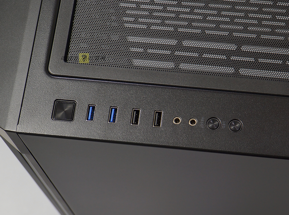 측면은 모두 평평한 디자인으로 되어 있으며 전면부는 쿨링을 고려하여 메쉬 타공 구조로 되어 있습니다. 저렴한 빅타워지만 너비는 245mm로 여유 공간이 많은 편입니다.