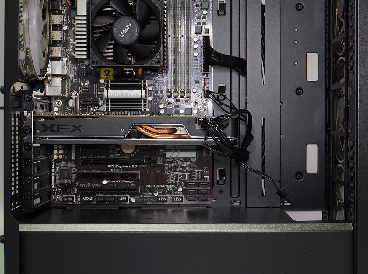 그래픽카드는 최대 375mm까지 장착이 가능하며 PCI 슬롯은 일회용이 아닌 재사용이 가능한 브라켓이 7개 부착되어 있습니다. 브라켓 사이에 중앙 가이드가 없어 브라켓을 모두 제거한 후 라이저 킷을 사용하여 그래픽카드 수직 장착이 가능합니다. 단 라이저 카드 킷과 거치대는 별도 구매해야 합니다.