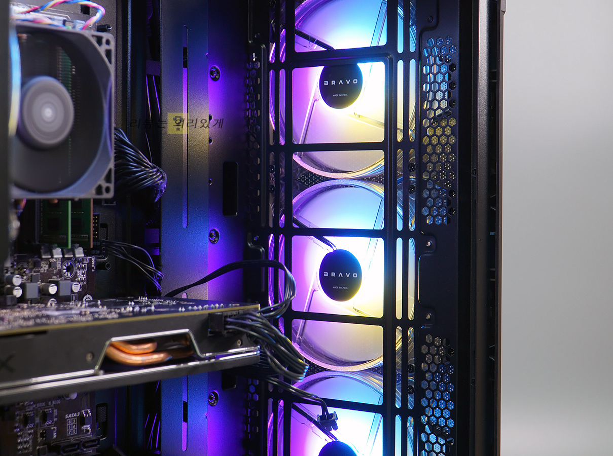 번들 팬으로 제공되는 140mm 팬은 우수한 쿨링을 기대할 수 있으며 최대 7개까지 장착이 가능합니다. 3색 LED로 무난한 튜닝 효과를 기대할 수 있으나 상단에 LED 버튼이 있기는 하나 허브(별매)와 ARGB 팬이 아닌 이유로 인하여 색상 변경은 되지 않습니다.