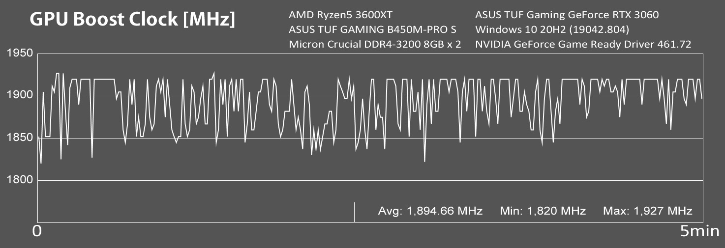 부스트 클럭은 평균 약 1,895 MHz, 최소 1,820 MHz, 최대 1927 MHz로 확인되었습니다.