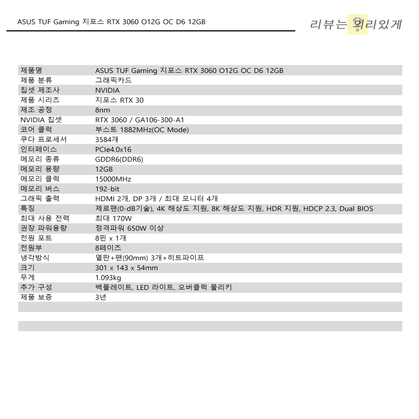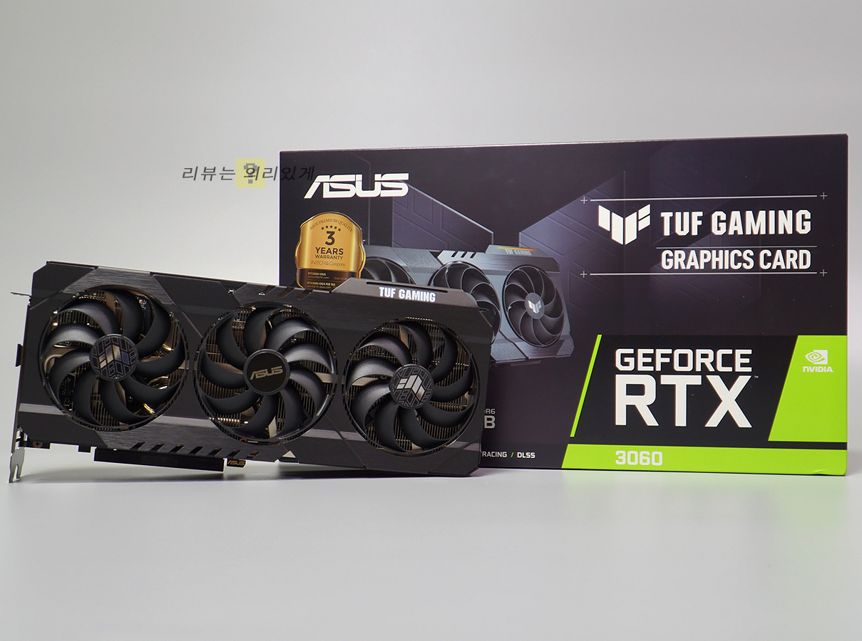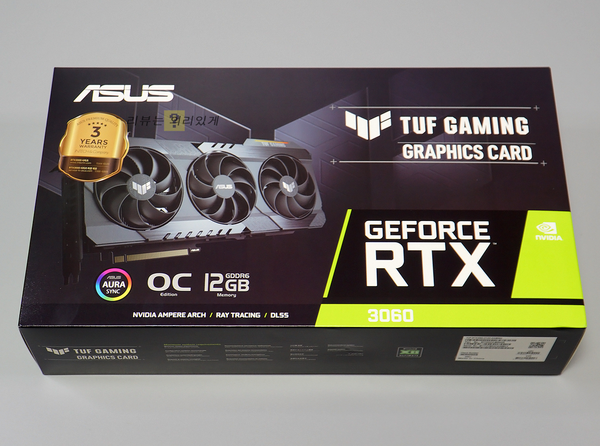 리뷰에 사용된 제품은 ASUS TUF Gaming 지포스 RTX 3060 O12G OC D6 12GB이며 에이수스의 보급형 그래픽카드입니다. TUF라는 이름은 에이수스의 게이밍 브랜드 중 하나로 주로 보급형 라인에서 쉽게 찾아볼 수 있습니다. 인텍앤컴퍼니에서 A/S를 받을 수 있으며 3년 무상 보증을 지원합니다.