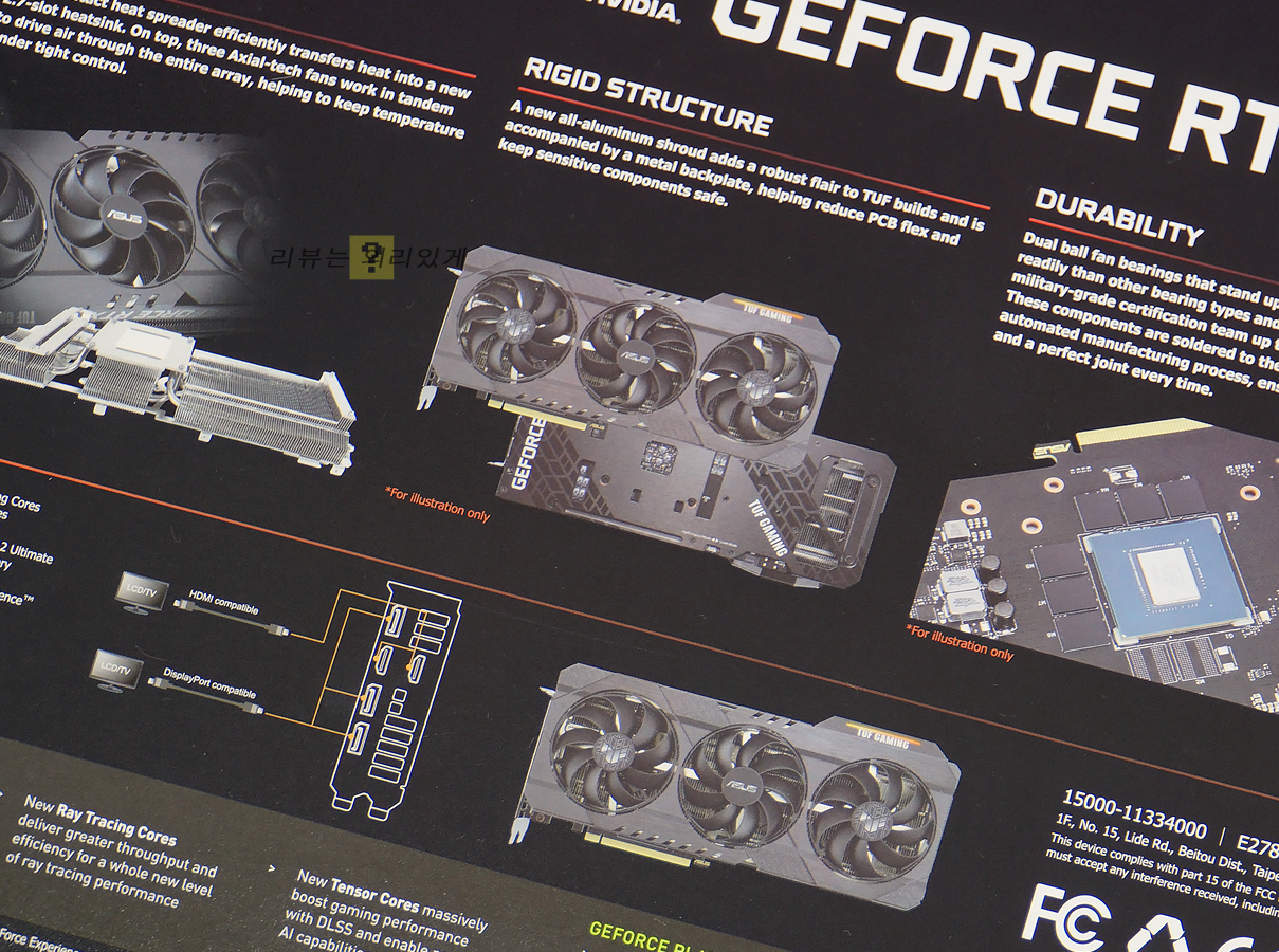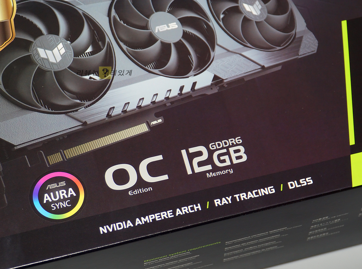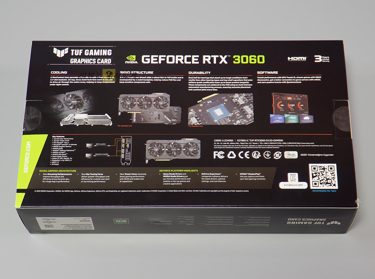 리뷰에 사용된 제품은 ASUS TUF Gaming 지포스 RTX 3060 O12G OC D6 12GB이며 에이수스의 보급형 그래픽카드입니다. TUF라는 이름은 에이수스의 게이밍 브랜드 중 하나로 주로 보급형 라인에서 쉽게 찾아볼 수 있습니다. 인텍앤컴퍼니에서 A/S를 받을 수 있으며 3년 무상 보증을 지원합니다.