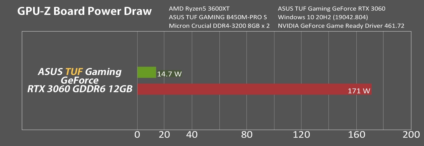 소비전력은 GPU-Z에 표기된 Board Power Draw를 기준으로 하였습니다. 유휴 상태에서 약 14,7 W, 풀로드 시 171 W로 확인되었습니다. 프로그램을 기준으로 하였기 때문에 정확하다 볼 수 없기 때문이 참고만 하시길 바랍니다.