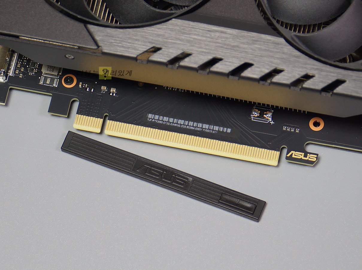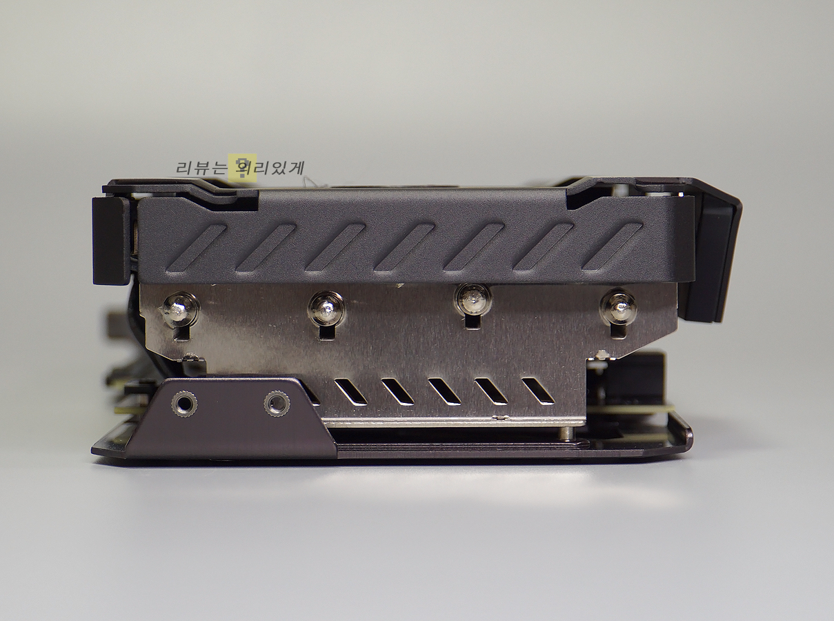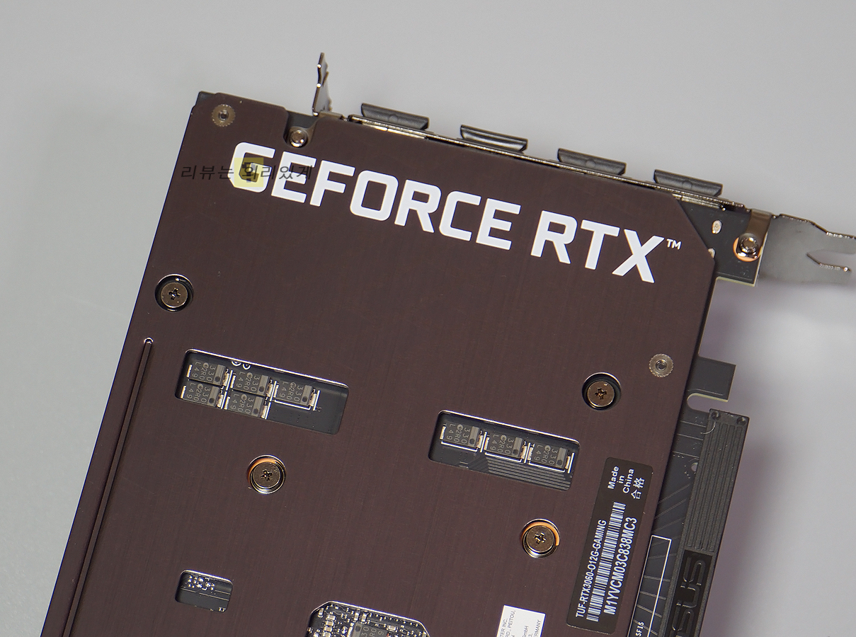 상판과 마찬가지로 알루미늄 소재의 백플레이트가 부착되어 있으며 쿨링을 위한 통풍구를 확인할 수 있습니다. 플라스틱에서 금속의 느낌을 표현하기 위해 헤어라인을 많이 사용하곤 하지만 3060 TUF는 리얼 금속을 사용하여 진짜 헤어라인을 확인할 수 있습니다.