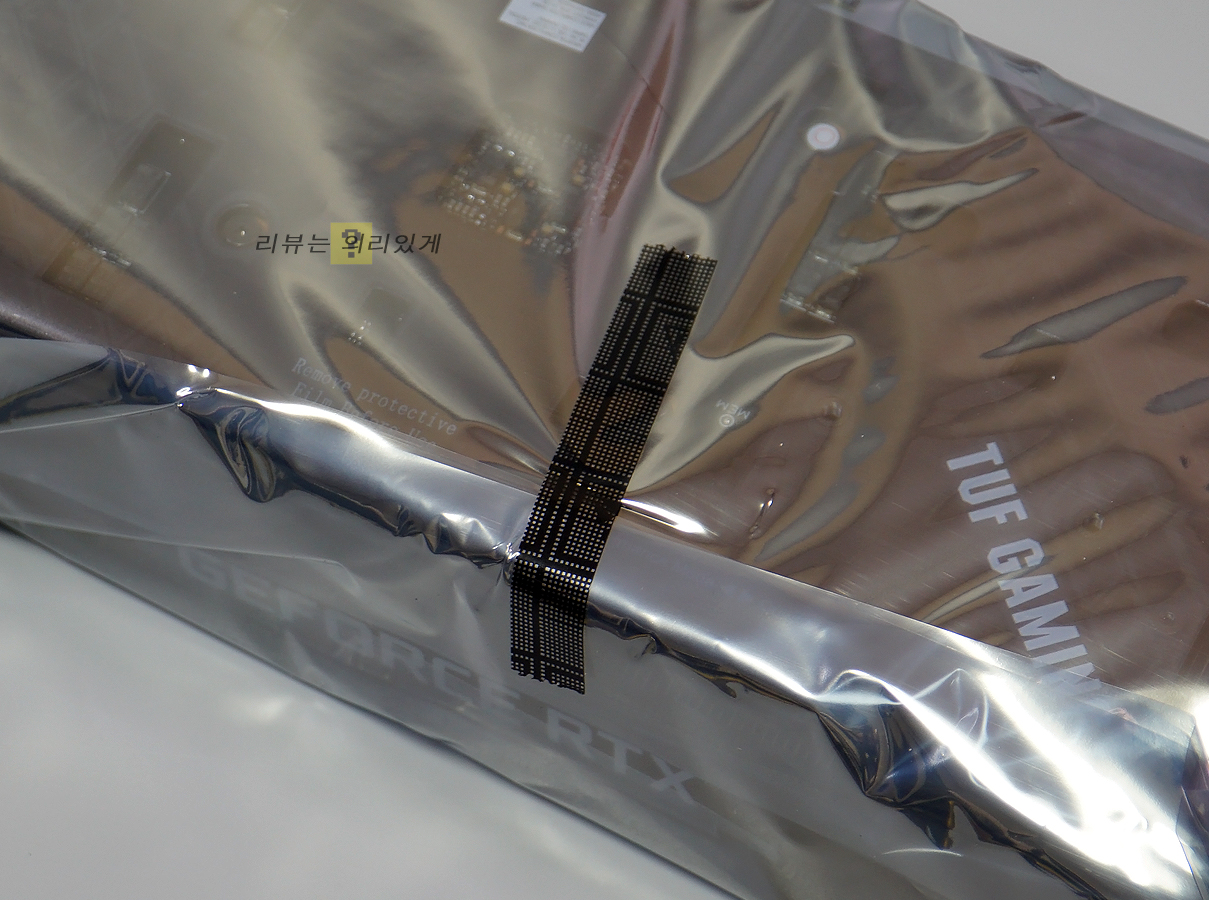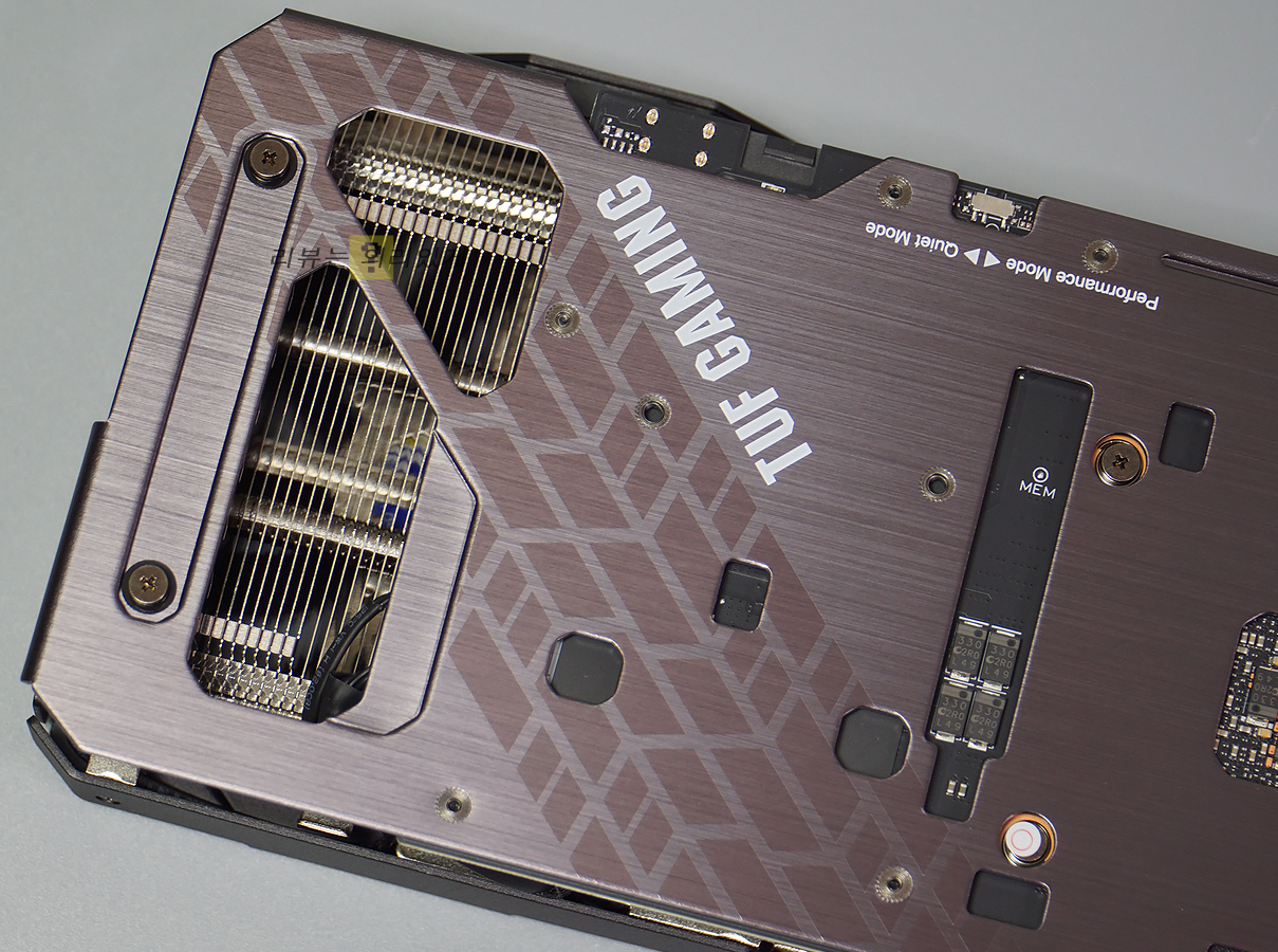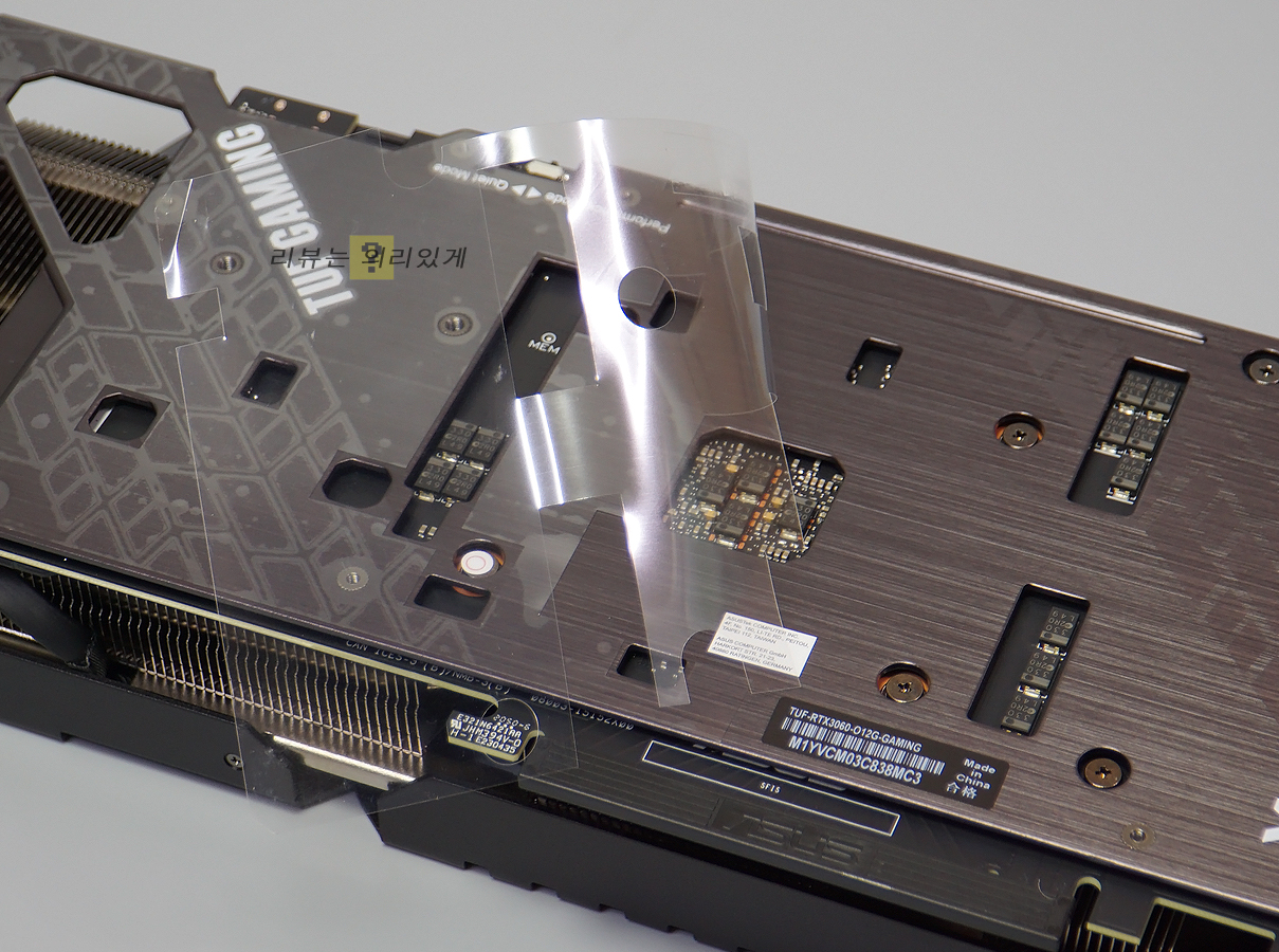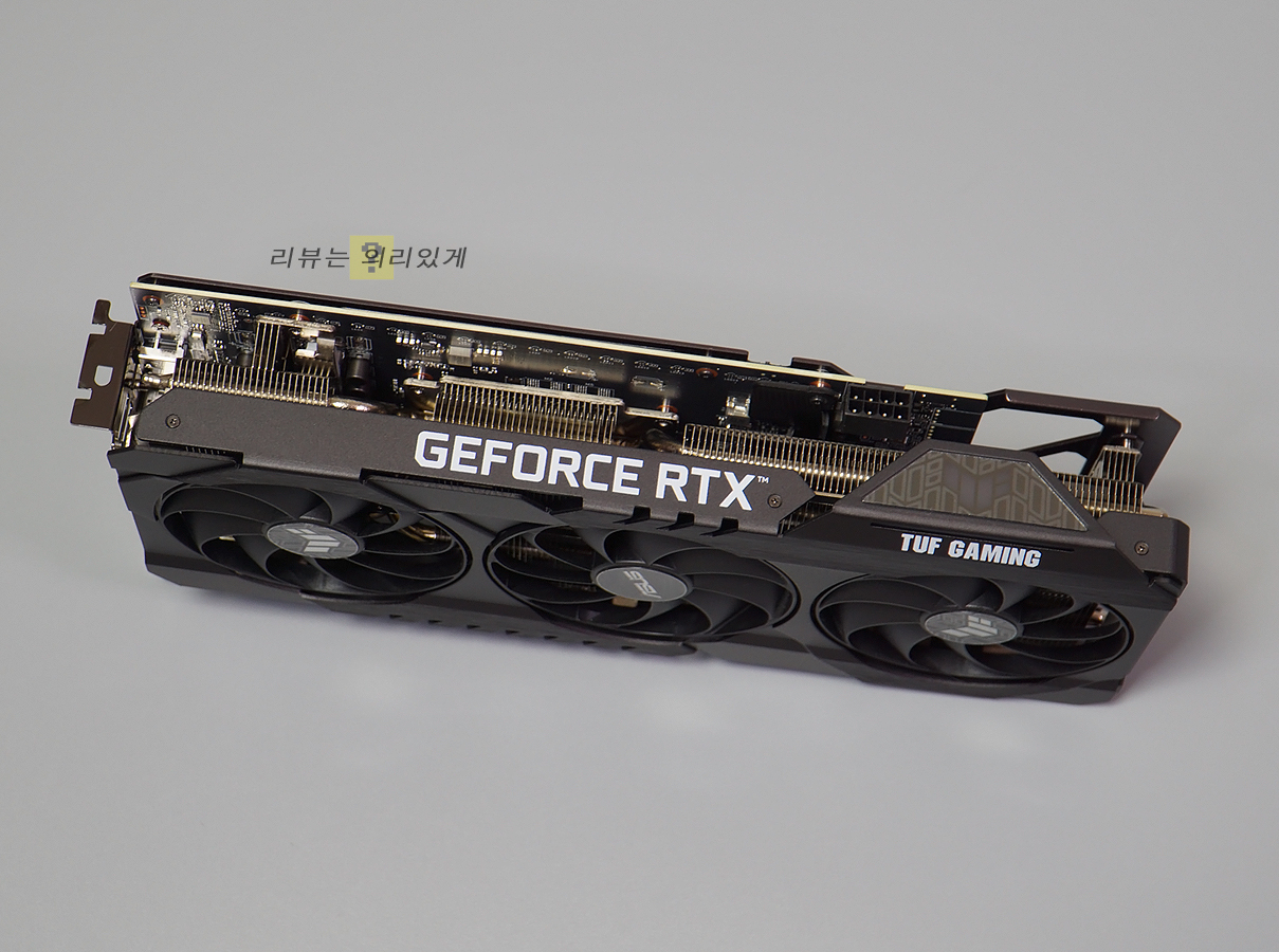 상판과 마찬가지로 알루미늄 소재의 백플레이트가 부착되어 있으며 쿨링을 위한 통풍구를 확인할 수 있습니다. 플라스틱에서 금속의 느낌을 표현하기 위해 헤어라인을 많이 사용하곤 하지만 3060 TUF는 리얼 금속을 사용하여 진짜 헤어라인을 확인할 수 있습니다.