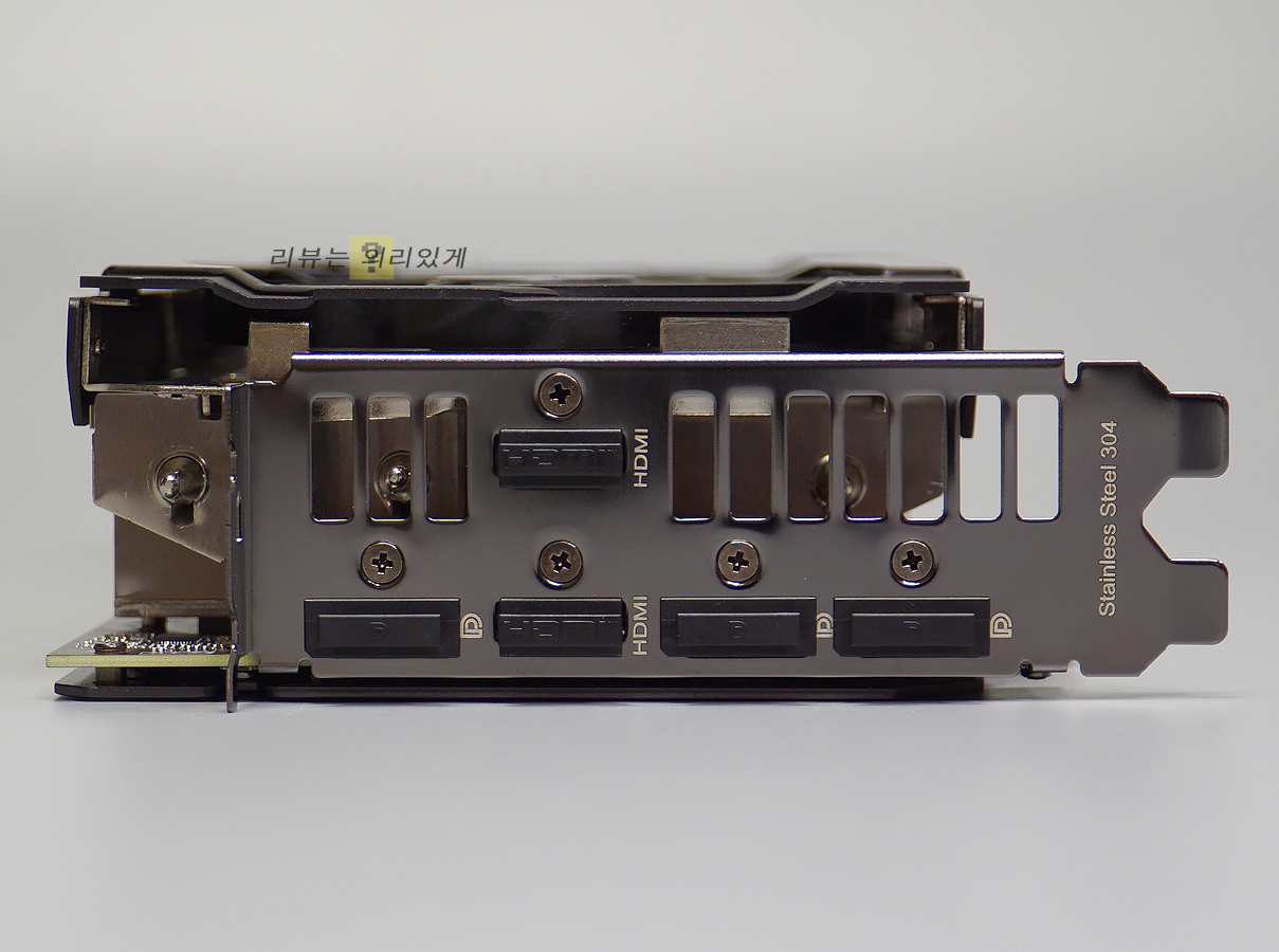 출력 포트는 HDMI 2.1 2개, DP 1.4 3개로 구성되어 있으며 포트마다 마개가 제공되고 있습니다. 보급형 제품에서 출력 포트를 넉넉하게 제공된 것은 이 제품만의 특징으로 볼 수 있습니다.