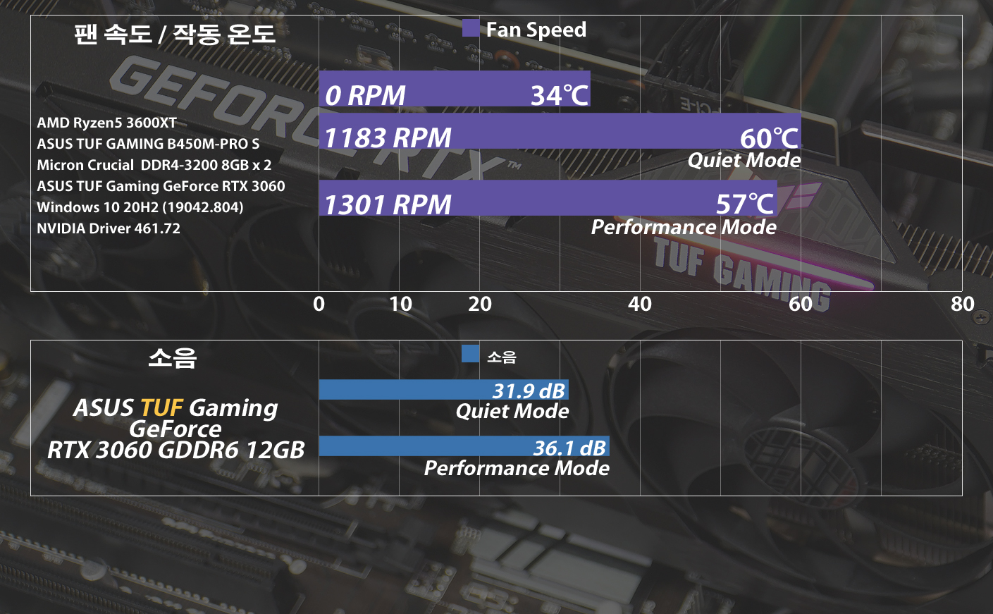팬 속도, 온도, 소음측정 결과 퍼포먼스 모드가 콰이어트 모드에 비해 약간 높게 나왔으나 팬 속도가 빠른 만큼 온도는 낮게 측정되었습니다. 소음에 민감하다면 콰이어트 모드를 사용하는 것을 추천하지만 퍼포먼스 모드에서도 충분히 정숙한 사용이 가능합니다.