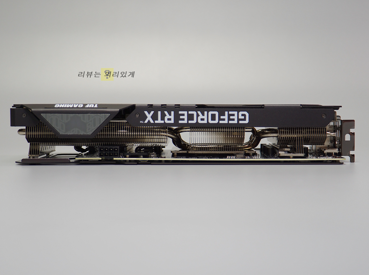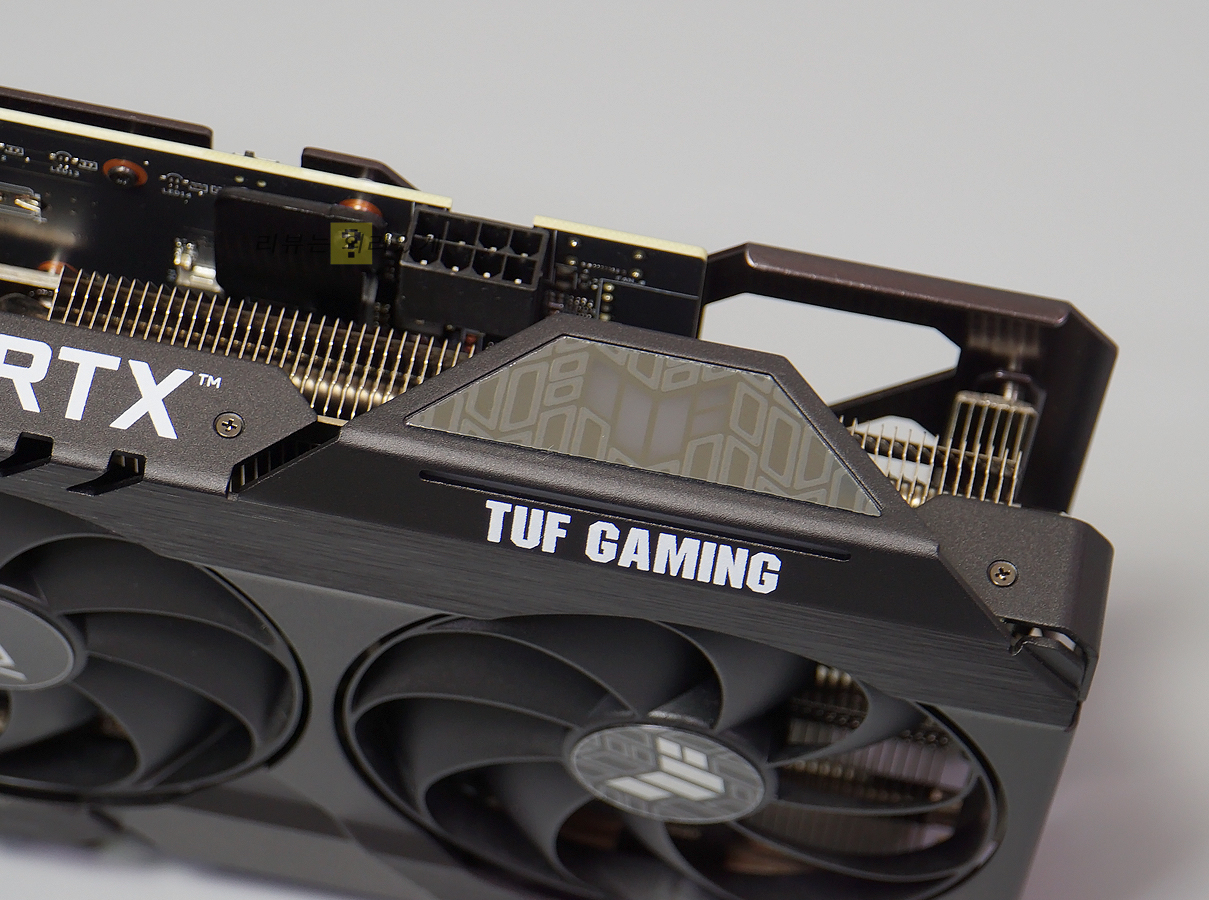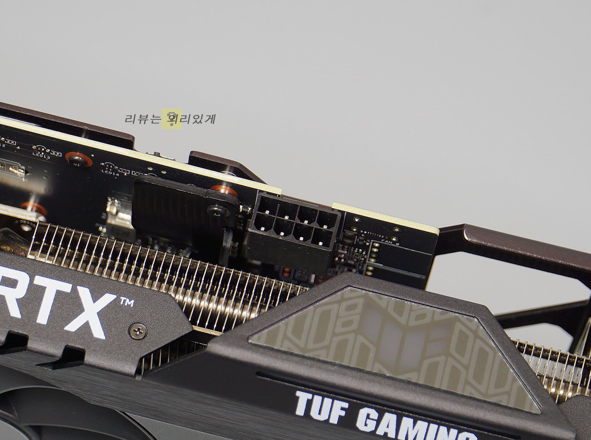 측면에는 GEFORCE RTX, TUF GAMING 문구가 각인되어 있으며 LED가 점등되는 곳을 확인할 수 있습니다. TGP는 약 170W이며 8핀 1개를 사용합니다. 상품정보에서 확인할 수 있는 권장 파워는 650W이지만 600W 정도만 되어도 충분히 사용이 가능합니다.