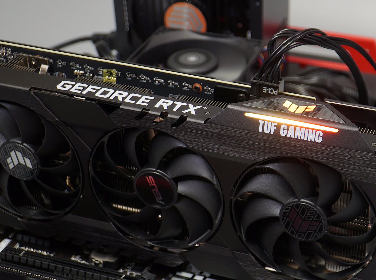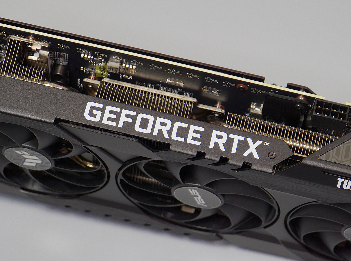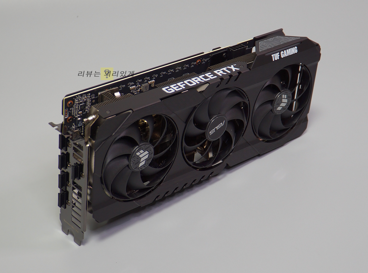 측면에는 GEFORCE RTX, TUF GAMING 문구가 각인되어 있으며 LED가 점등되는 곳을 확인할 수 있습니다. TGP는 약 170W이며 8핀 1개를 사용합니다. 상품정보에서 확인할 수 있는 권장 파워는 650W이지만 600W 정도만 되어도 충분히 사용이 가능합니다.