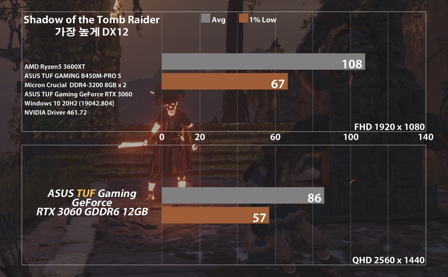 처음 공개된 RTX 3060의 성능은 기대와 달리 실망스러운 점이 많았습니다. 상위 제품인 RTX 3060 TI가 RTX 2080 SUPER과 경쟁하는 모델인 것에 비해 3060은 RTX 2060 SUPER 또는 RTX 2070과 비교되고 있으니 아쉬운 소리가 나오는 것은 당연합니다. 이러한 이유는 대역폭을 포함해 TMU, ROP가 줄어든 것과 RTX 3060 TI가 GA104 컷 칩을 사용한 것에 비해 GA106-300-A1 GPU 코어가 사용된 점을 성능 하락의 이유로 봐야 합니다.