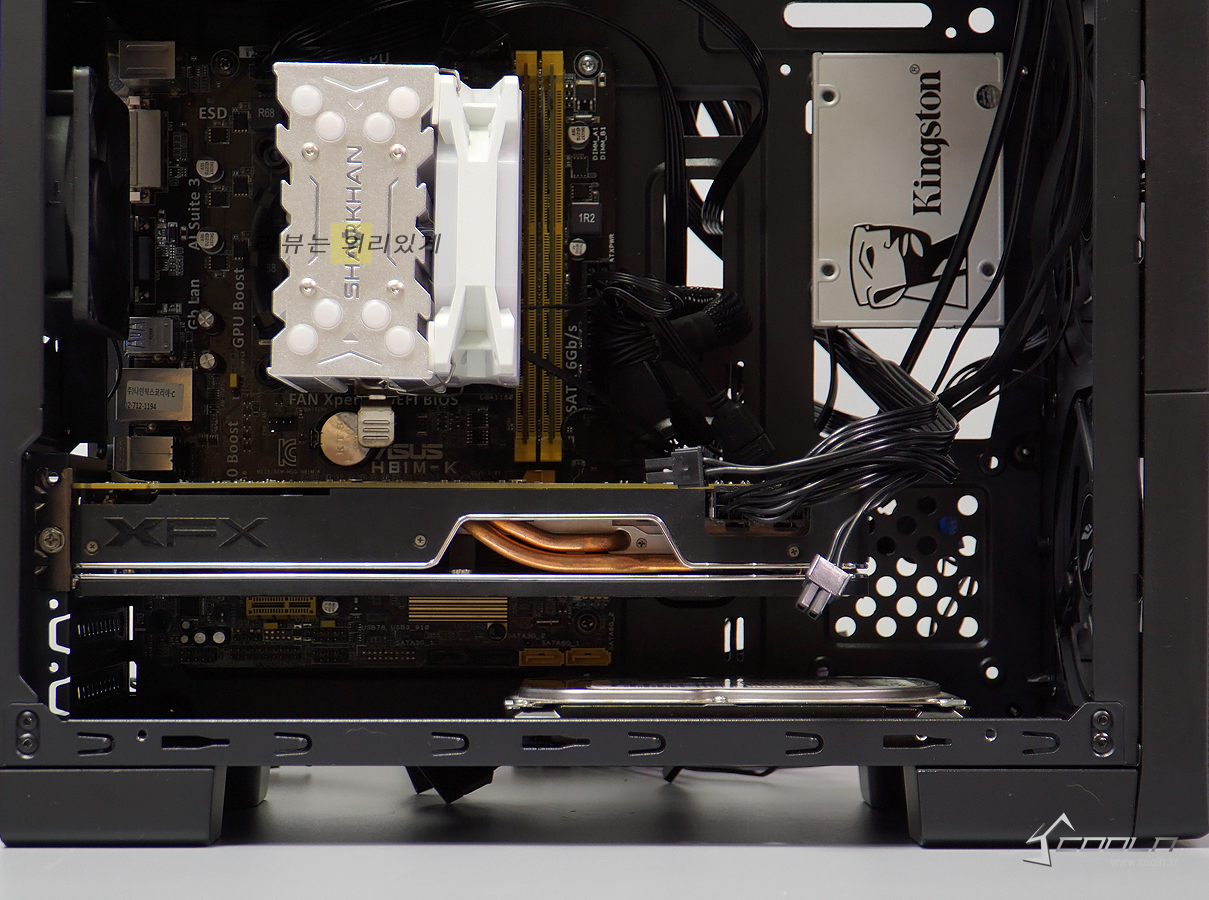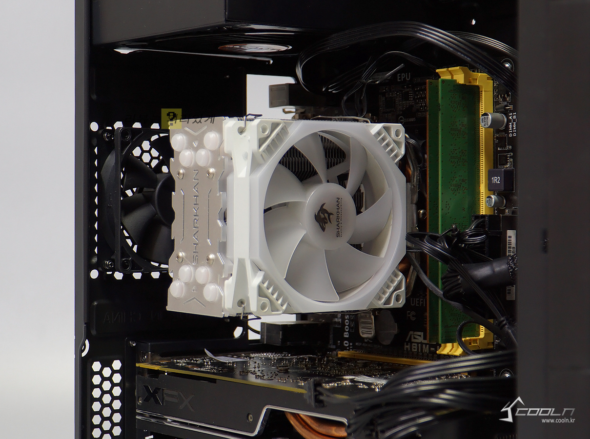 리뷰에 사용된 CPU 쿨러는 92mm 팬이 장착되어 있으며 마지노선처럼 이 이상의 쿨러 장착은 어려워 보였습니다.
