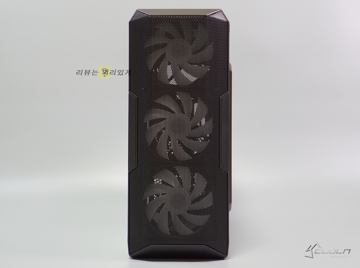 전면에는 120mm RGB LED 팬 3개가 번들 팬으로 제공되고 있으며 전면 베젤에는 먼지 필터가 포함되어 있지 않습니다.