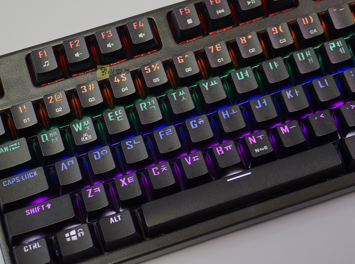 키 캡을 자세히 살펴보면 한글, 영문 외에 추가적인 문구를 확인할 수 있는데 펑션키(FN)를 사용하여 방향키 전환, 동시입력, 윈도우 잠금 키 같은 기능을 사용할 수 있습니다.