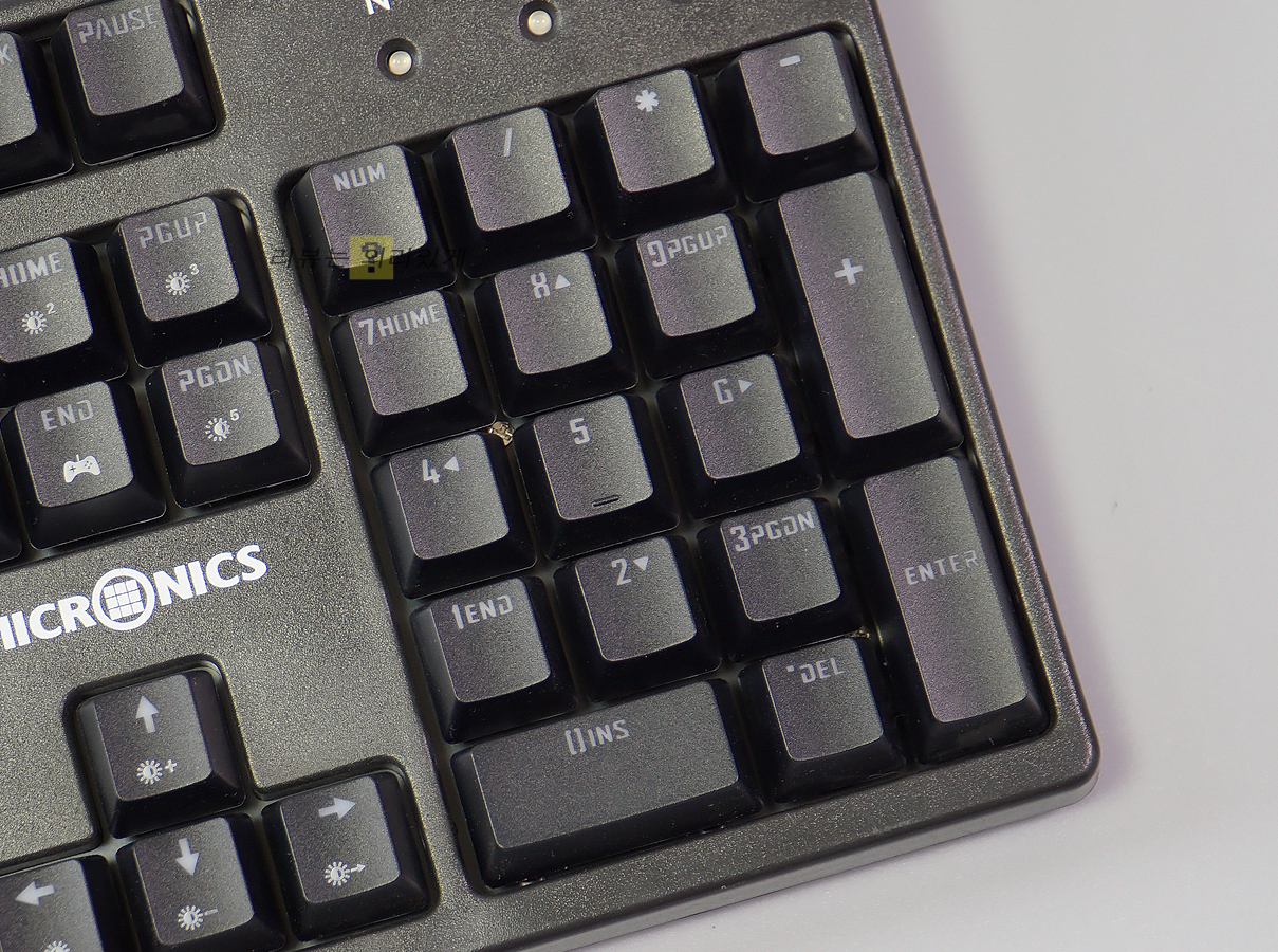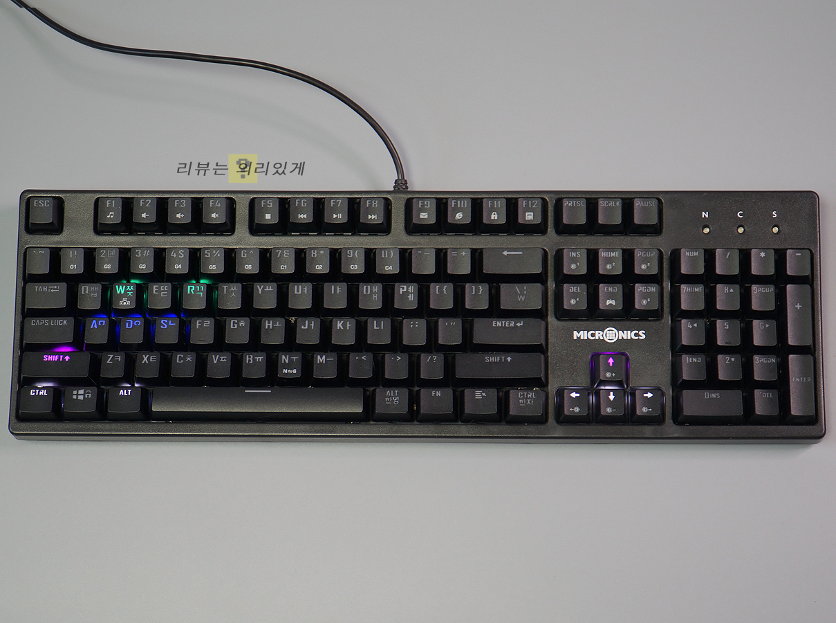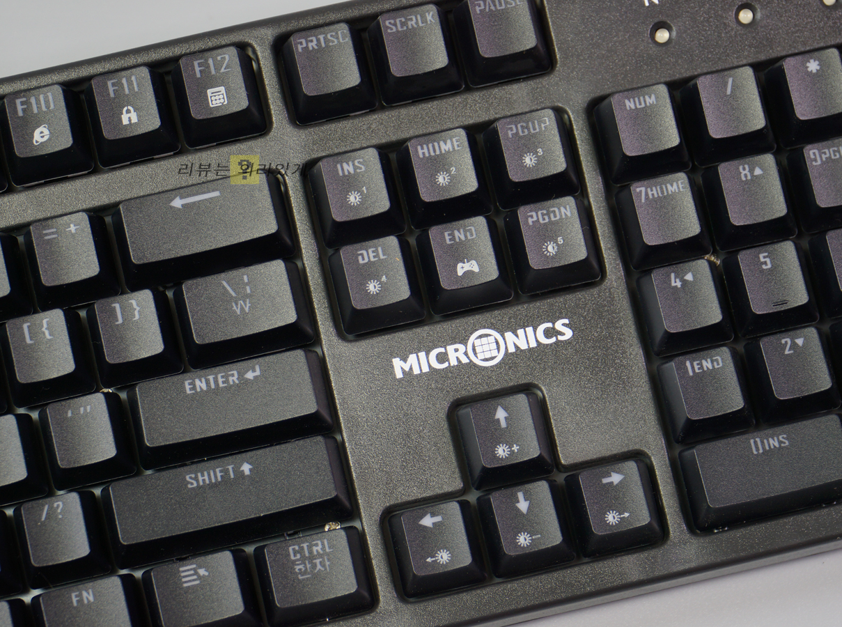 흔히 볼 수 있는 104키 배열 방식을 사용하고 있으며 키 캡과 하우징 모두 무광 블랙 도장이 되어 있습니다. 방향 키에 마이크로닉스 로고가 있는 것을 제외하면 특별함 없는 디자인이라 볼 수 있으며 스텝스컬쳐2가 적용되었습니다.