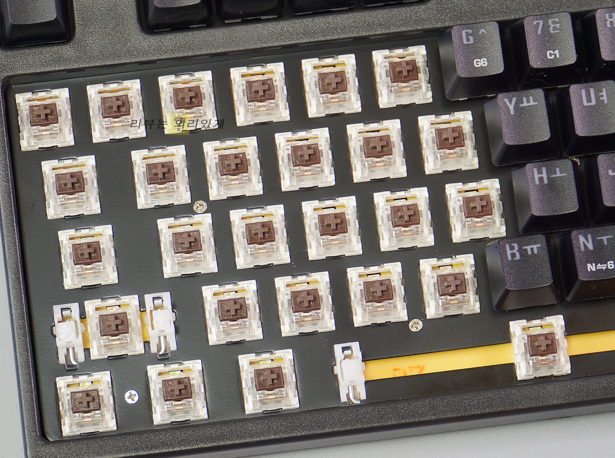 스위치는 마닉 2세대가 사용되었으며 청축, 갈축 ,적축으로 출시되었습니다. 리뷰에 사용된 제품은 갈축 입니다. 또한 체리식 스태빌라이저가 적용된 모습입니다.