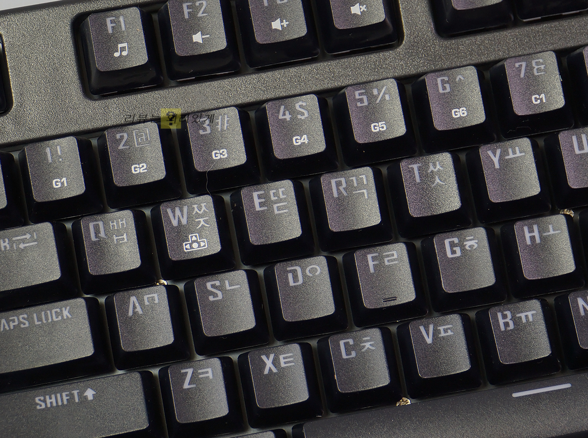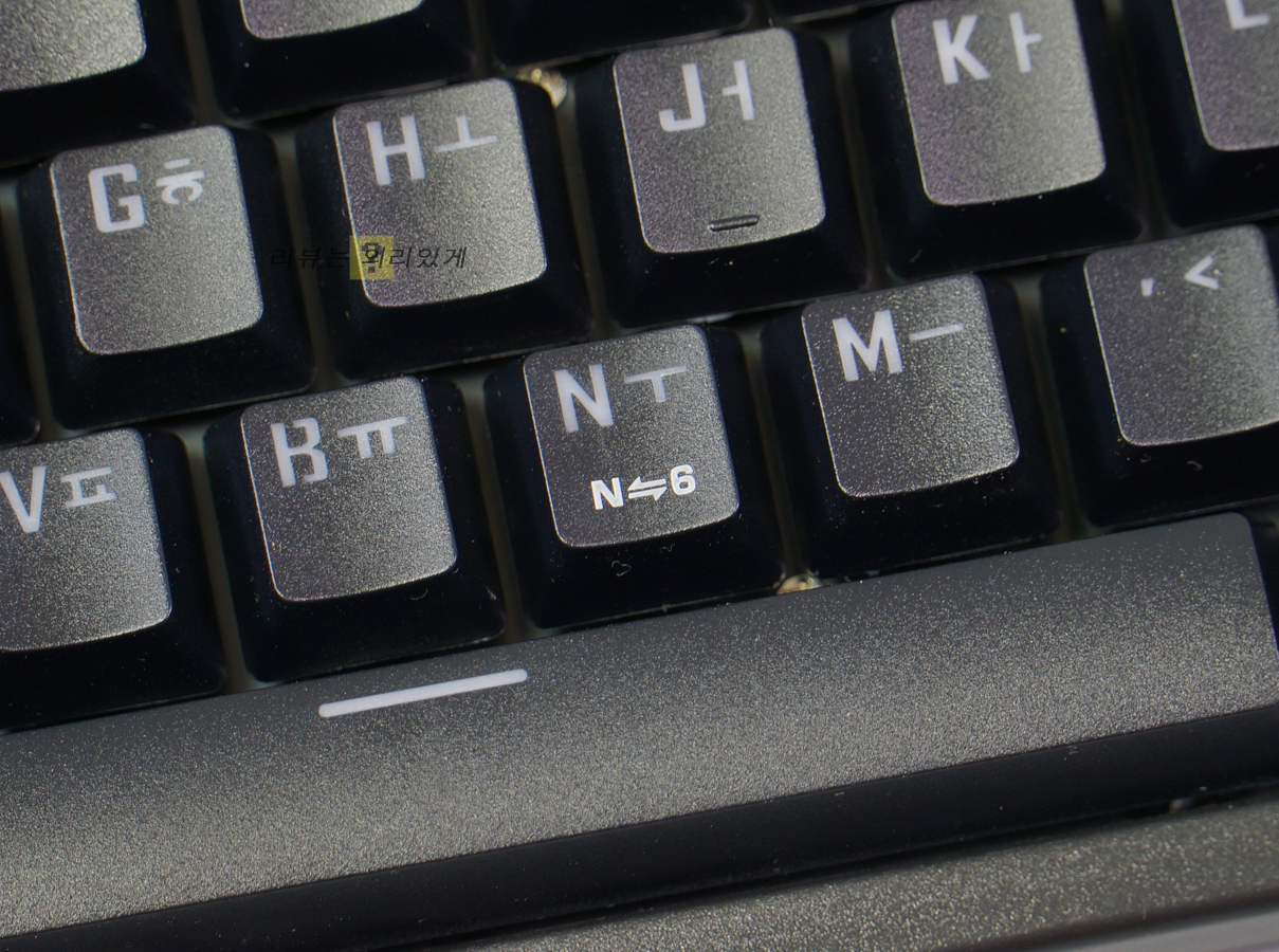 키 캡 재질은 ABS이며 이중 사출 방식을 사용하였습니다. 또한 각인 위치 한/영 정각으로 되어 있습니다.