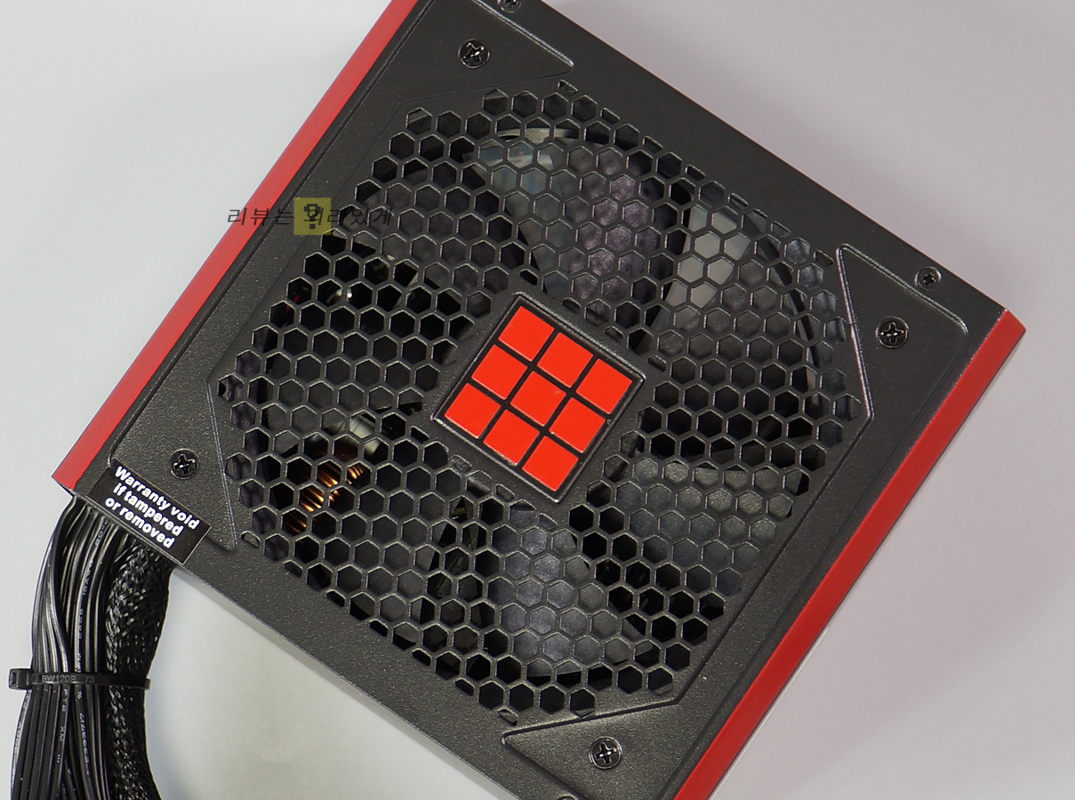 팬 그릴 일체형 구조가 적용되었으며 벌집형 통풍구 방식을 사용하고 있습니다. 또한 한쪽 면에는 워런티 스티커가 부착되어 있습니다.