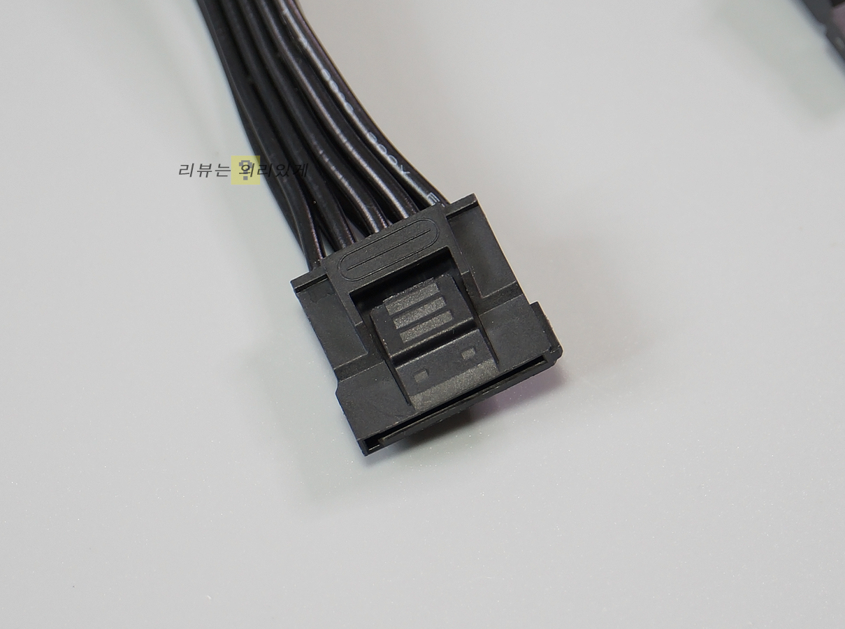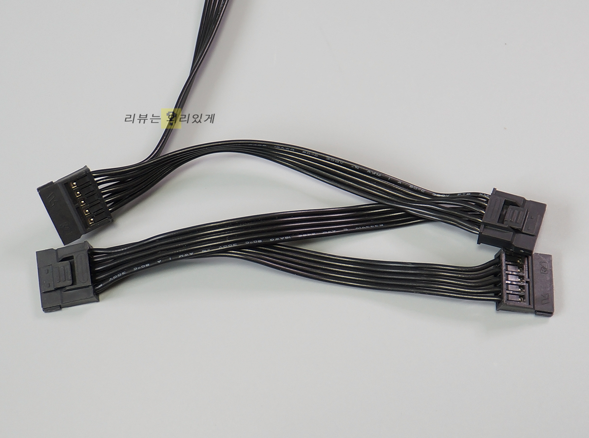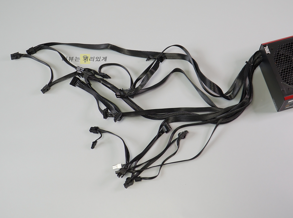 일반적인 보급형 파워에 비해 파워 용량이 늘어난 만큼 SATA 커넥터 8개, PCIe 8핀 2개처럼 확장성이 크게 상승하였음을 알 수 있습니다. 특히 보조전원은 8+4+4핀으로 구성되어 있어 최신 인텔, AMD 시스템 사용을 고려한 모습입니다. 케이블 두께는 보조전원, PCIe 케이블에 16AWG이며 그 외 FDD 케이블을 제외한 나머지는 모두 18AWG로 구성되어 있습니다. 또한 SATA, IDE 4커넥터 탈착을 고려하여 락킹, 이지스왑 방식이 적용되어 기존 방식에 비해 탈부착이 편리해졌으며 안정적인 장착이 가능해졌습니다.