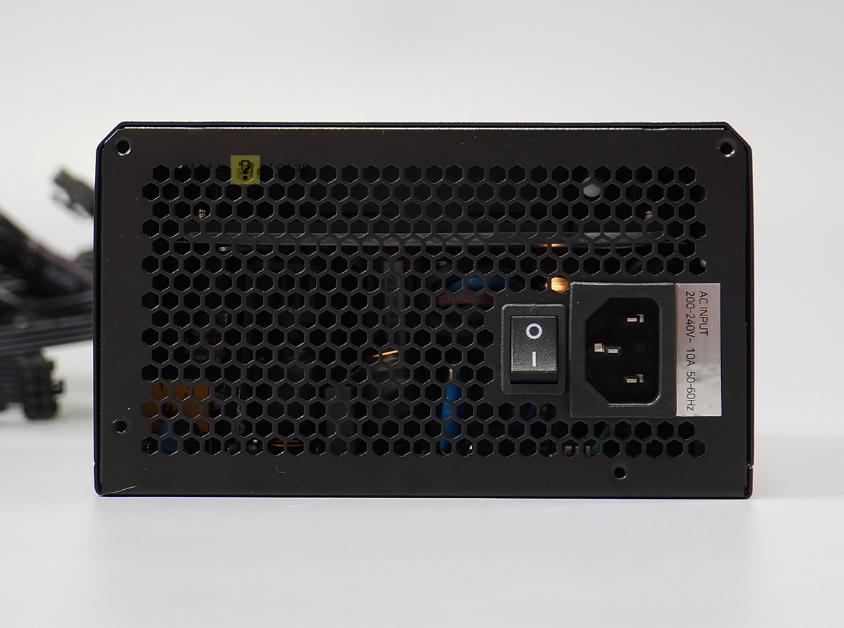 측면에는 제품 스펙이 적혀 있는 스티커가 부착되어 있으며 후면에는 원활한 통풍을 위한 벌집형 구조의 통풍구를 확인할 수 있습니다.