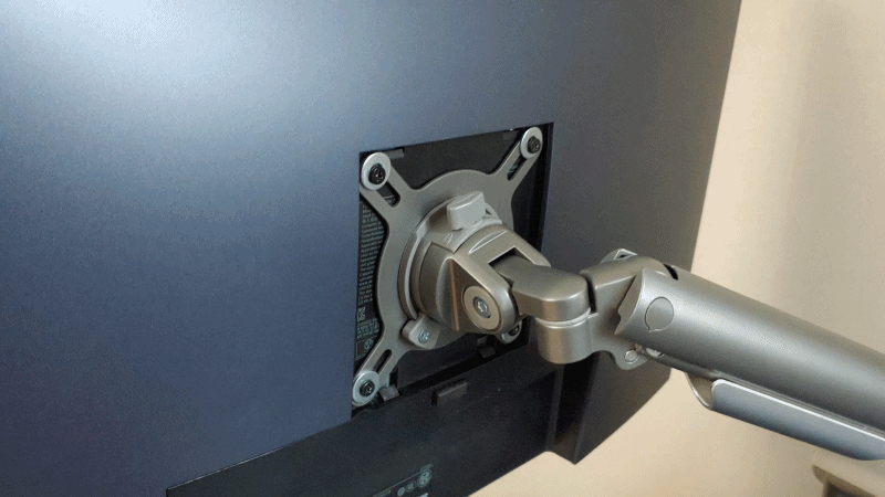 VESA 홀 방식을 사용하며 75 x 75mm, 100 x 100mm를 지원합니다. 베사판은 위에서 슬라이드 방식으로 결합하게 되며 1단암 상단의 원터치 락을 사용하여 손쉽게 고정이 가능합니다.
