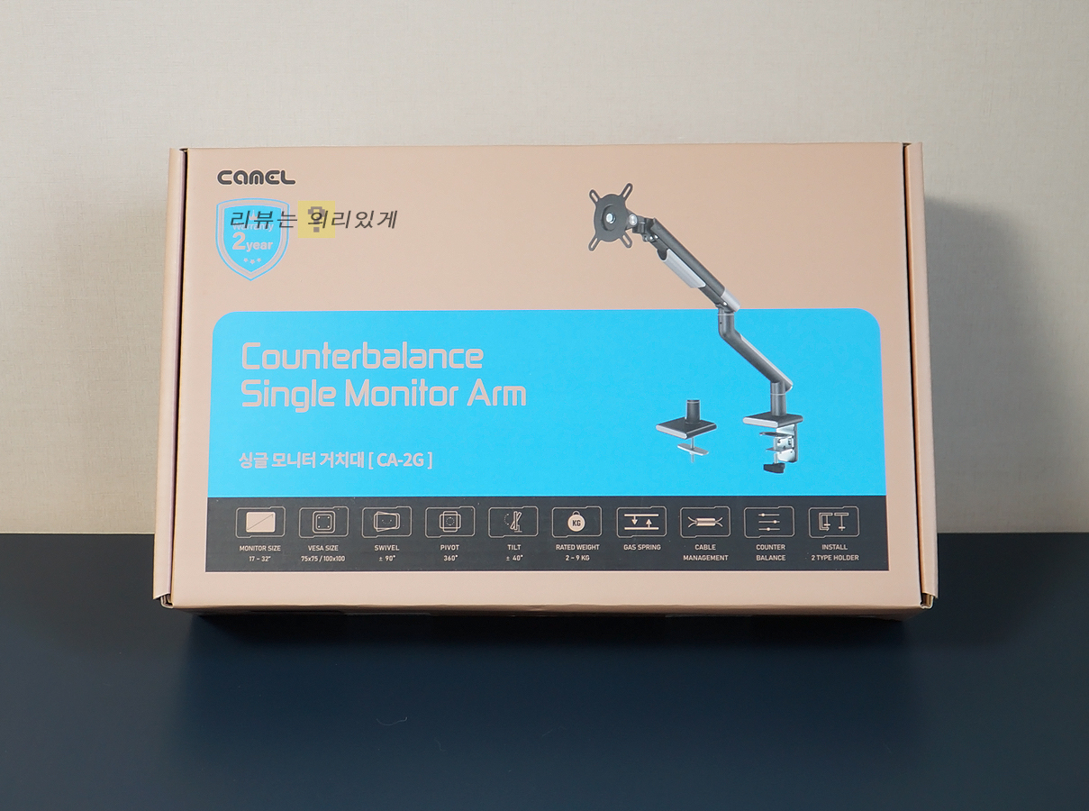 카멜마운트 CA2 이지밸런스 싱글 모니터 암은 최대 32인치까지 장착이 가능한 싱글 모니터 암으로 저렴한 가격에 적당한 성능의 제품을 만나볼 수 있는 제품입니다. 몇 년 전 카멜마운트 모니터 암을 사용해 본 적이 있는 데 당시 보급형 제품이라는 것을 감안하더라도 디자인이 상당히 투박하여 좋은 인상을 주지는 못하였습니다. 그러나 이번에 사용해 본 제품은 이전과 달리 세련된 모습을 보여주는 등 많은 변화가 있다는 것을 알 수 있었습니다.