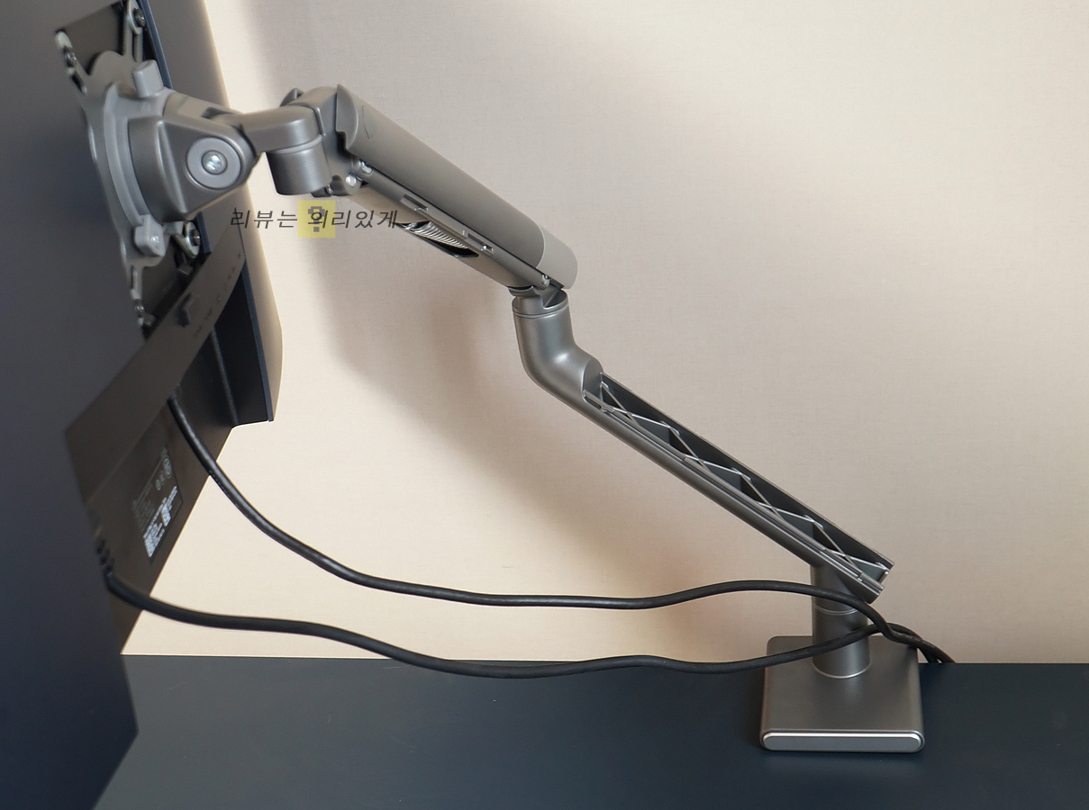 리뷰에는 27인치 모니터가 사용되었으며 제품은 최대 32인치까지 장착이 가능합니다. 육각렌치를 사용하여 장력조절을 하여 아예 고정시킬 것인지 아니면 방향, 높낮이 등을 조절할 것인지를 선택할 수 있습니다. 물론 위 이미지처럼 모니터 회전이나 상, 하 각도 같은 여러 방향으로 회전이 가능하며 높낮이 조절도 가능합니다.