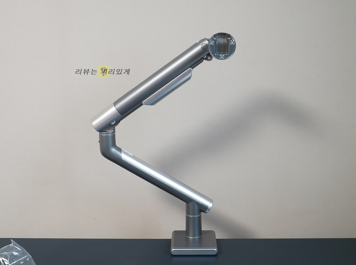 조립 방식은 책상 두께 10~55mm인 경우로 진행하였습니다. 클램프 홀더와 고정 레버, 클램프 본체를 사용하여 책상에 고정시키며 클램프 조립 시 육각렌치를 사용해야 합니다. 모니터 암은 1단암, 2단암 2가지로 구성되며 전체적으로 파이프 같은 형태를 보여주고 있으며 알루미늄 소재를 사용하여 전체적으로 무난한 디자인을 확인할 수 있습니다.