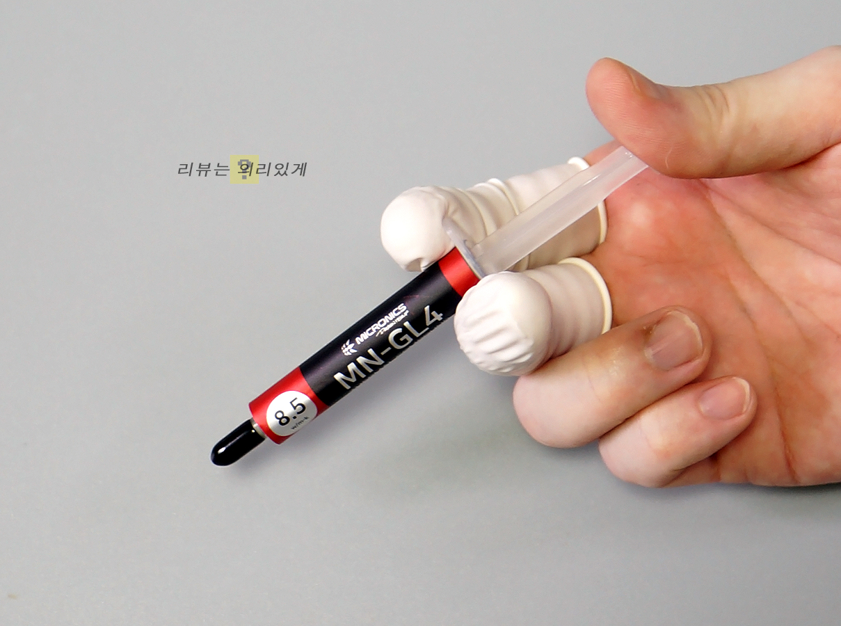 주사기 형태의 외형으로 전면에는 마개가 부착되어 있습니다. 앞서 언급한 것 처럼 GL4는 4g 제품이라는 것을 의미하며 용량 외에 차이점은 없습니다. 써멀을 도포하다 보면 손에 묻기도 하는 데 이를 방지하기 위해 위 이미지 처럼 골무가 제공되고 있습니다.