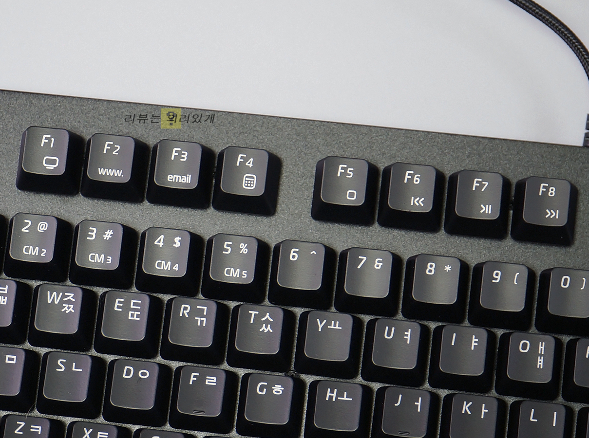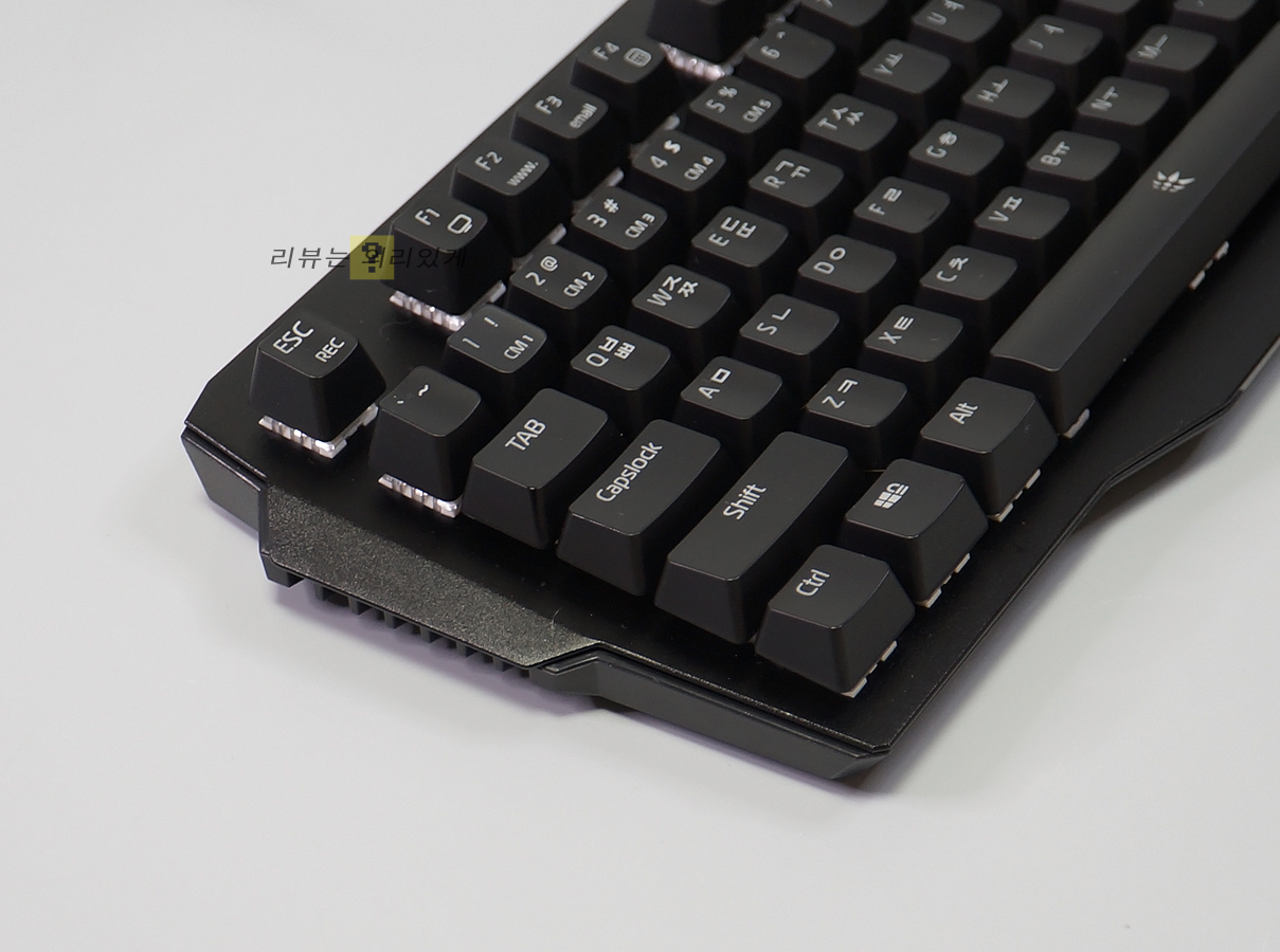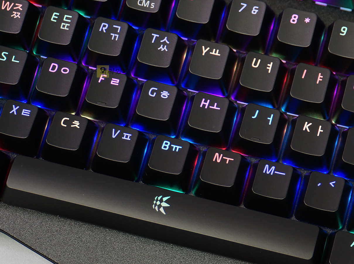 한글, 영문 모두 이중 도장 방식으로 시인성을 높였으며 폰트 디자인은 전체적으로 딱딱하지 않고 부드러운 느낌이었습니다. 윈도우 락 커스텀 LED 모드 등 게이밍 키보드에서 흔히 볼 수 있는 기능들 또한 제공하고 있습니다.