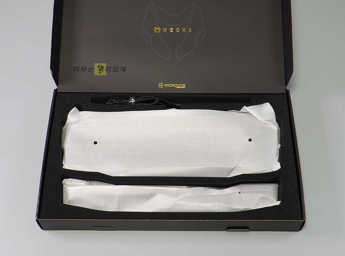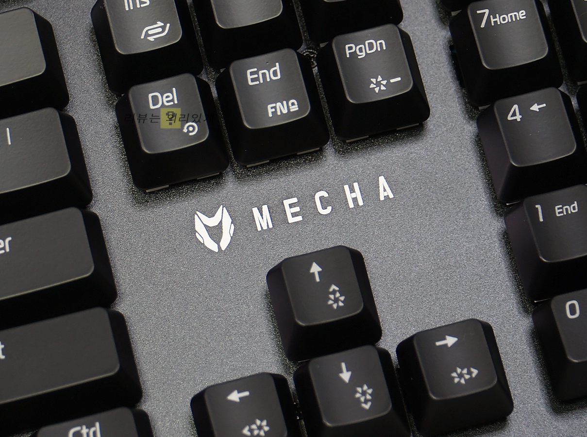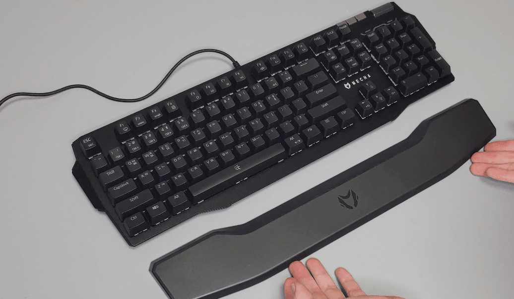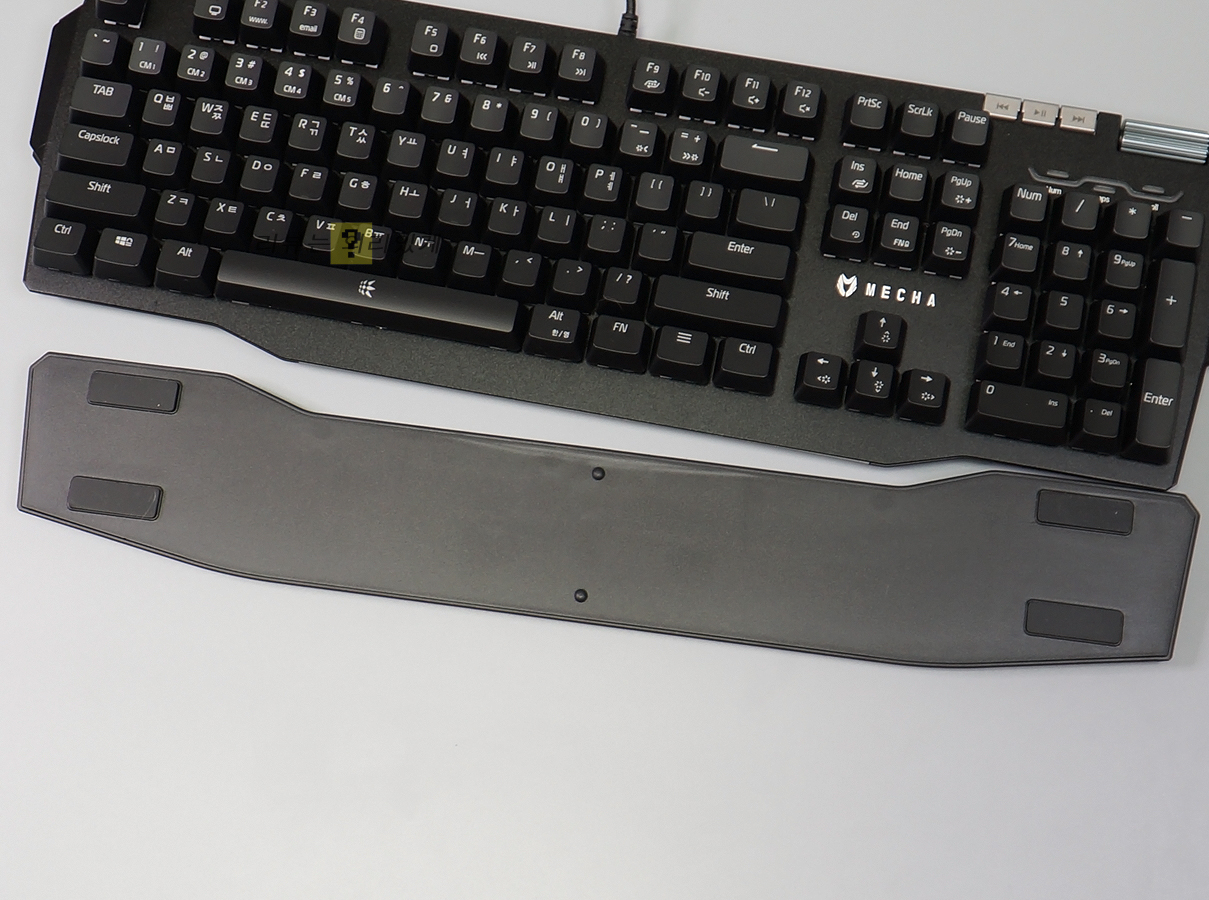 기본 제공되는 팜레스트는 자석식으로 탈부착이 편리합니다. 플라스틱 소재를 사용하였으며 가운데 MECHA 로고를 확인할 수 있습니다. 바닥면에는 미끄럼 방지를 위한 패드가 부착되어 있습니다.